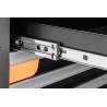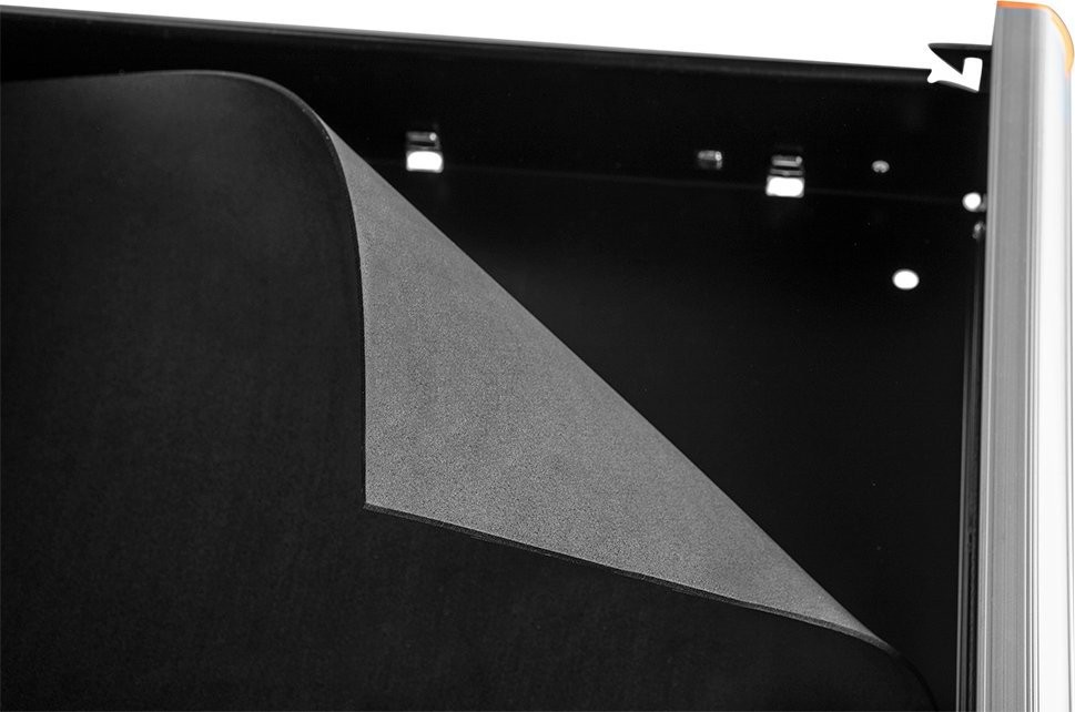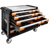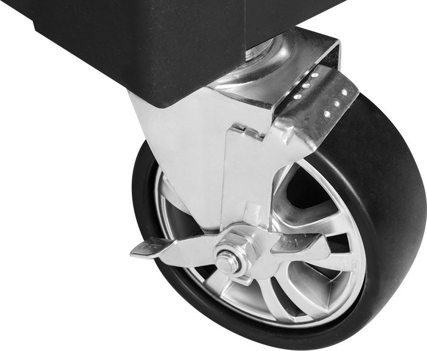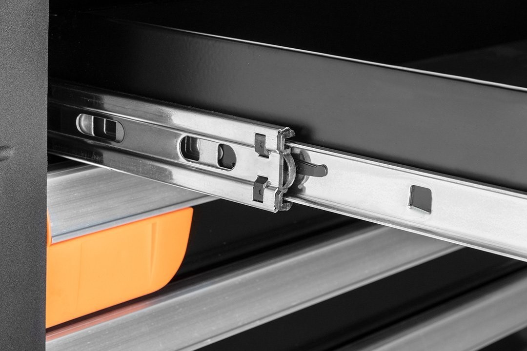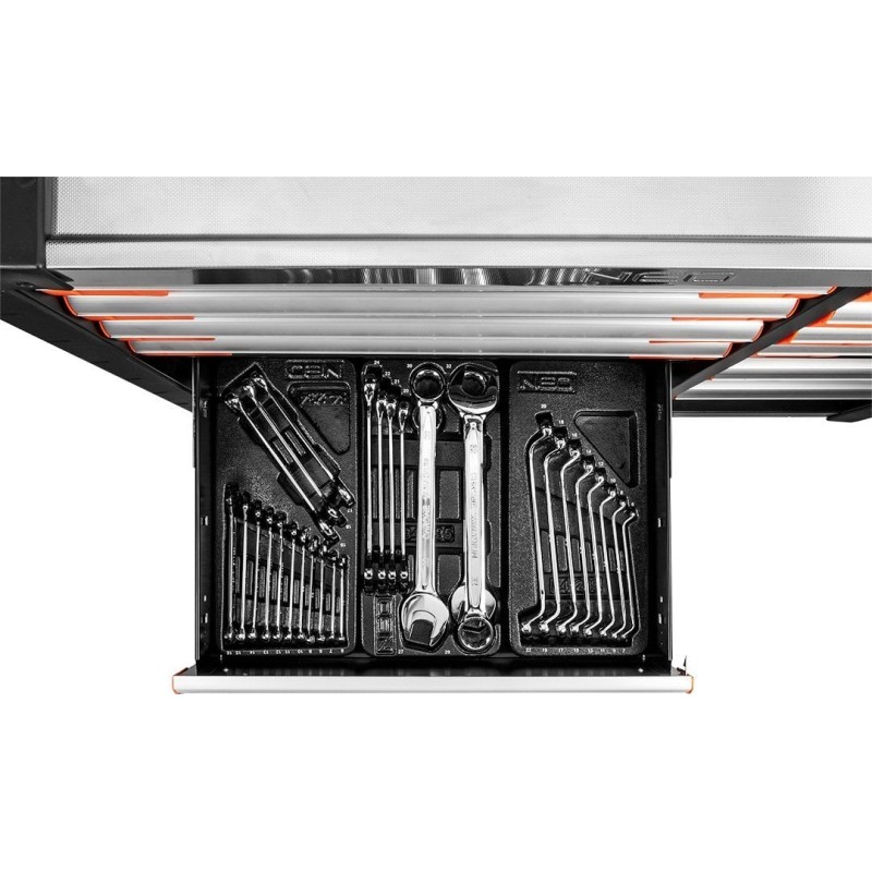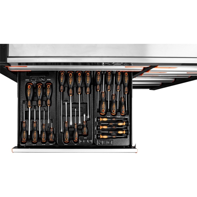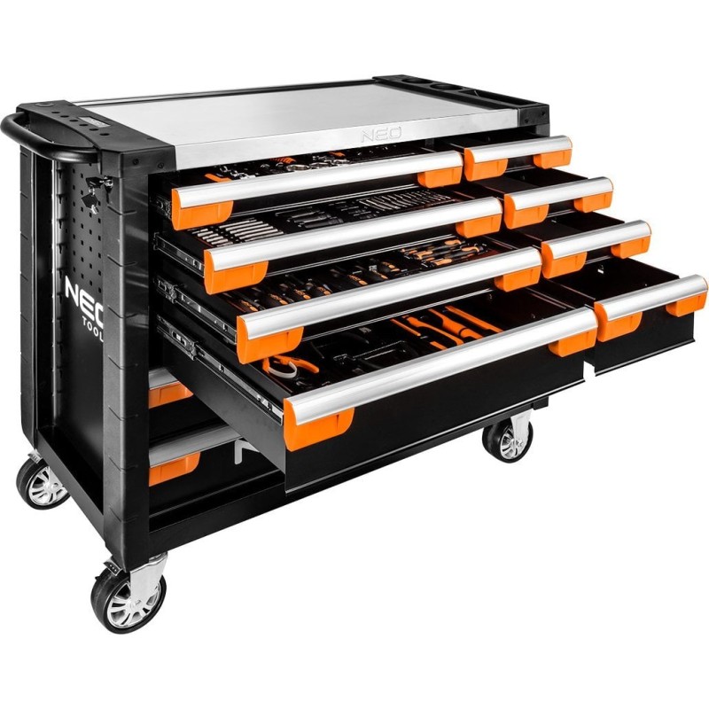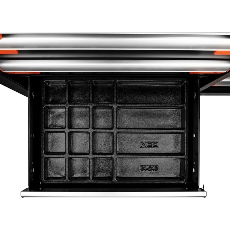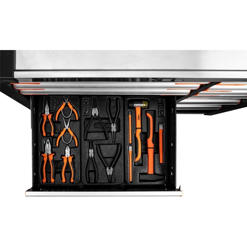 Werkzeugschrank mit 12 Schubladen, 1105 x 465 x 825 mm (mit Rollen 978 mm), 6 große Schubladen, davon 3 niedrige mit den Maßen 560 x 400 x 60 mm und 3 hohe mit den Maßen 560 x 400 x 139 mm, 6 kleine, davon 3 niedrige mit den Maßen 252,5 x 400 x 60 mm und 3 hohe mit den Maßen 252,5 x 400 x 139 mm, Stahlkorpus, Tragkraft 600 kg, Aluminium-Arbeitsplatte mit Ablagen für Schraubendreher und Zubehör, seitliche Lochung für Haken und NEO-Zubehör, Eckpuffer, Seitengriff, Schubladenverriegelung, Schubladen 100 % ausziehbar, kompatibel mit NEO-Werkzeugeinsätzen, Kugelführungen, Zentralverriegelung, zwei Schlüssel, Feststellbremse, Schubladen mit 2 mm dicken EVA-Matten, 5-Zoll-PU-Rollen. Zusatzausstattung für Schränke mit den Artikelnummern: 84-249, 84-247, 84-246, 84-242, 84-241, 84-240, 84-239, 84-238, 84-237, 84-236, 84-235, 84-234, 84-233, 84-232, 84-231, 84-230