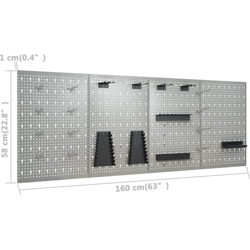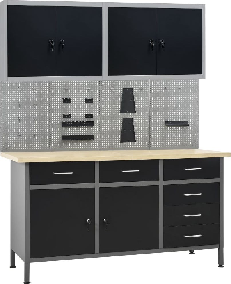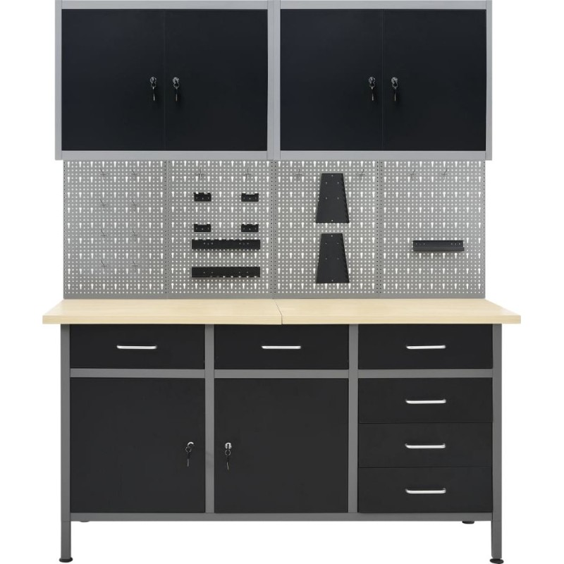 Dieses Set besteht aus 1 Arbeitstisch, 4 Wandpaneelen und 2 Wandschränken und bietet eine praktische Aufbewahrungslösung für die Werkstatt oder Garage. Der robuste Arbeitstisch zeichnet sich durch viel Stauraum und eine Tragkraft von 500 kg aus. Die große und stabile Arbeitsplatte bietet eine solide Arbeitsfläche für alle Reparaturarbeiten. Der Werkbanktisch verfügt über 6 Schubladen, um Werkzeuge, Teile und Zubehör wie Schrauben, Nägel und Klebeband ordentlich zu verstauen. Alle Schubladen sind mit kugelgelagerten Führungen ausgestattet, um ein leichtgängiges Ausziehen zu gewährleisten. Das Möbelstück verfügt über 2 Ablagefächer und einen großen Stauraum mit 2 abschließbaren Türen, in dem Bohrmaschinen, Kabeltrommeln und Schleifmaschinen problemlos Platz finden. Zudem sind die Füße höhenverstellbar. Diese Werkbank ist aus bestem Stahl und Spanplatten gefertigt, wodurch sie besonders robust, langlebig und leicht zu reinigen ist. Das Set ist einfach zu montieren. Diese Werkzeugpaneele aus massivem Stahl können das Gewicht verschiedener Werkzeuge wie Bohrmaschinen, Zangen, Schraubendreher und Schraubenschlüssel tragen. Die Platten sind perforiert, damit die Werkzeuge einfach und sicher aufgehängt werden können. Die 4 Paneele lassen sich miteinander verbinden, um ihre Stabilität zu erhöhen. Mit einer Breite von 160 cm ist dies die ideale Lösung für Ihren Arbeitstisch und Ihren Werkstattschrank. Das Möbelstück verfügt über zwei verstellbare Einlegeböden und eine perforierte Platte mit Löchern, an der verschiedene Werkzeuge wie Schraubenschlüssel, Zangen, Hämmer usw. aufgehängt werden können. Ausgestattet mit zwei abschließbaren Türen (jeweils 2 Schlüssel sind im Lieferumfang enthalten) sorgt der Schrank für mehr Sicherheit. Die Metallkonstruktion mit einer besonders robusten, kratzfesten Beschichtung macht das Möbelstück strapazierfähig und leicht zu reinigen. Das Produkt muss zusammengebaut werden. Werkbank: Farbe: schwarz, grau Material: Stahl, Spanplatte, Metalllegierung Maße: 160 x 60 x 85 cm (L x B x H) Plattenstärke: 3 cm Maximale Belastung: 500 kg Maximale Belastung einer einzelnen Schublade: 10–15 kg Mit 6 Schubladen auf Kugellagerschienen Mit 2 Schränken mit abschließbaren Türen Tischplatte mit holzähnlicher Maserung Höhenverstellbare Füße Montage erforderlich: ja WARNUNG: Um ein Umkippen des Produkts zu verhindern, müssen die mitgelieferten Befestigungselemente zur Wandmontage verwendet werden.Wandpaneel:Farbe: grau Material: StahlAbmessungen (Einzelstück): 40 x 58 x 1 cm (L x B x H)Metallstärke: 0,5 mmDurchmesser der kleinen Öffnung: 5,5 mmAbmessungen der Längsöffnung: 9,4 x 22,5 mm (B x H)Verschiedene ÖffnungenHängeschrank:Farbe: grau-schwarzMaterial: Metall Maße (jeweils): 80 x 19 x 60 cm (B x T x H) Mit 2 verstellbaren Einlegeböden mit Aufhängern und 1 Lochblech Mit 2 abschließbaren Türen (zu jeder Tür gehören 2 Schlüssel) Montage erforderlich: ja Lieferumfang: 1 x Werkbank 4 x Wandpaneel 21 x Montagezubehör 2 x Hängeschrank...