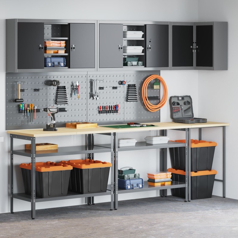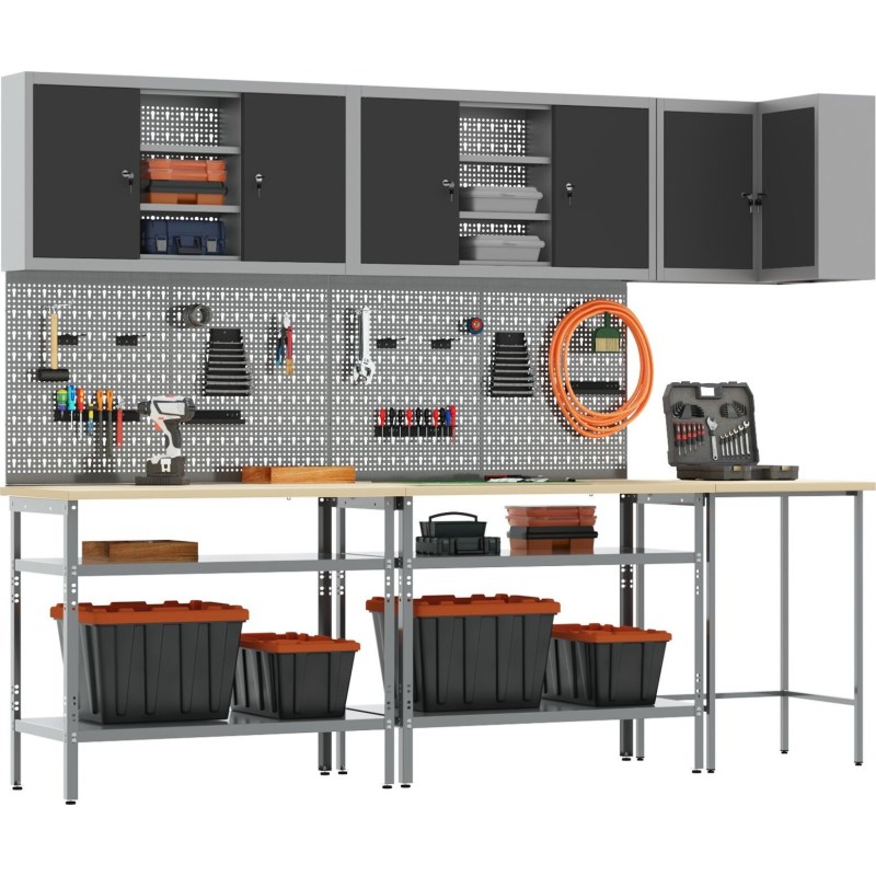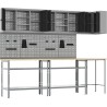 • Integrierte Aufbewahrung: Zahlreiche Lochplatten und Schränke helfen dabei, den Arbeitsplatz ordentlich zu halten. Das erleichtert nicht nur die Arbeit, sondern sorgt auch für mehr Ordnung und steigert die Produktivität, da alles seinen festen Platz hat.
