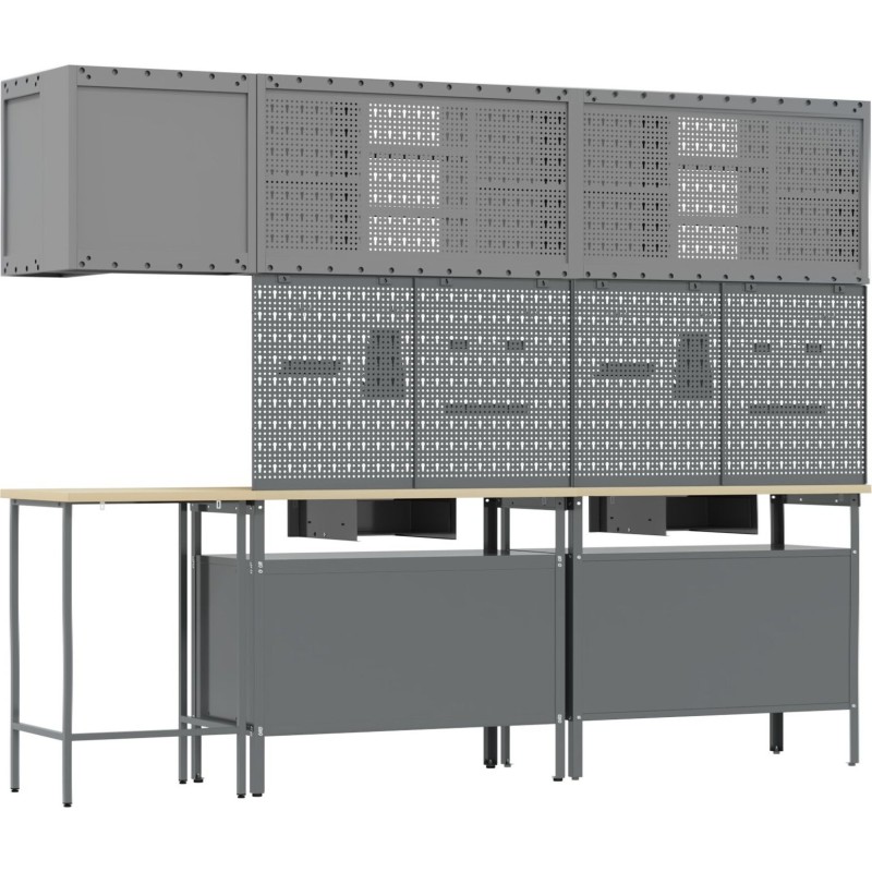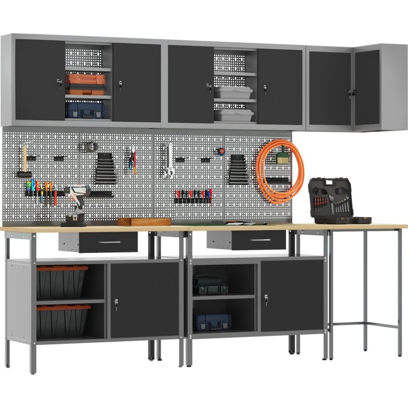 Dieser höhenverstellbare Werkbanktisch ist eine hervorragende Lösung für alle, die den Platz in ihrer Garage oder Werkstatt optimal nutzen und gleichzeitig ihre Werkzeuge ordentlich verstauen möchten. Sein industrielles Design, das Stahl und Holzwerkstoff kombiniert und eine holzähnliche Oberfläche aufweist, bringt Funktionalität und Stil in jeden Arbeitsbereich.