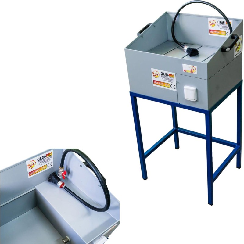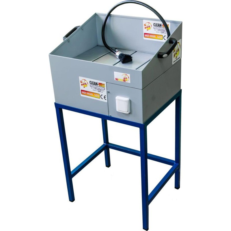 Herstellername: MST WAN 500 Die umweltfreundliche Werkstatt-Waschmaschine mit geschlossenem Reinigungsflüssigkeitskreislauf ist ein universelles Werkzeug, das in verschiedenen Reparatur- und Instandsetzungswerkstätten, in der industriellen Metallverarbeitung sowie überall dort zum Einsatz kommt, wo der technologische Prozess eine gründliche Reinigung und Entfettung von Werkzeugen oder Autoteilen erfordert. Funktionsweise der Waschmaschine: Die im unteren Teil der Waschanlage befindliche Reinigungsflüssigkeit wird durch eine elektrische Durchflusspumpe über einen Schlauch, der mit einer Durchlaufbürste endet, auf das zu reinigende Objekt (z. B. ein Motorteil) geleitet. Die durch die Bürste fließende Flüssigkeit löst fettige Verunreinigungen auf dem zu reinigenden Werkstück auf und spült sie ab. Am Boden des Behälters setzen sich die schwereren Bestandteile ab, während die Reinigungsflüssigkeit (die leichter ist) in den Kreislauf zurückkehrt. Der Kreislauf der Reinigungsflüssigkeit ist geschlossen.