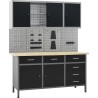Dieses Set besteht aus 1 Arbeitstisch, 4 Wandpaneelen und 2 Wandschränken und bietet eine praktische Aufbewahrungslösung für die Werkstatt oder Garage. Der robuste Arbeitstisch zeichnet sich durch viel Stauraum und eine Tragkraft von 500 kg aus. Die große und stabile Arbeitsplatte bietet eine solide Arbeitsfläche für alle Reparaturarbeiten. Der Werkbanktisch verfügt über 6 Schubladen, um Werkzeuge, Teile und Zubehör wie Schrauben, Nägel und Klebeband ordentlich zu verstauen. Alle Schubladen sind mit kugelgelagerten Führungen ausgestattet, um ein leichtgängiges Ausziehen zu gewährleisten. Das Möbel verfügt über 2 Ablagefächer und einen großen Stauraum mit 2 abschließbaren Türen, in dem Bohrmaschinen, Kabeltrommeln und Schleifmaschinen bequem Platz finden. Zudem sind die Füße höhenverstellbar. Diese Werkbank ist aus bestem Stahl und Spanplatten gefertigt, wodurch sie besonders robust, langlebig und leicht zu reinigen ist. Das Set ist einfach zu montieren. Die Werkzeugpaneele bestehen aus massivem Stahl, um das Gewicht verschiedener Werkzeuge wie Bohrer, Zangen, Schraubendreher und Schraubenschlüssel zu tragen. Die Platten sind perforiert, um Werkzeuge einfach und sicher aufhängen zu können. Die 4 Paneele lassen sich miteinander verbinden, um ihre Stabilität zu erhöhen. Mit einer Breite von 160 cm ist dies die ideale Lösung für Ihren Arbeitstisch und Ihren Schrank in der Werkstatt. Dieses Set verfügt über zwei Schränke zur Aufbewahrung von Werkzeugen. Der große Schrank verfügt über drei verstellbare Einlegeböden und eine Lochplatte. Der kleinere Schrank hat einen verstellbaren Einlegeboden und eine Lochplatte zum Aufhängen verschiedener Werkzeuge wie Schraubenschlüssel, Zangen, Hämmer usw. Der Werkzeugschrank ist mit einer abschließbaren Tür (2 Schlüssel im Lieferumfang enthalten) ausgestattet, um für mehr Sicherheit zu sorgen. Er besteht aus Metall mit einer besonders robusten, kratzfesten Beschichtung, wodurch er langlebig und leicht zu reinigen ist. Dieses Produkt muss zusammengebaut werden.Werkbank:Farbe: schwarz, grauMaterial: Stahl, Spanplatte, MetalllegierungMaße: 160 x 60 x 85 cm (L x B x H)Plattenstärke: 3 cmMaximale Belastung: 500 kgMaximale Belastung einer einzelnen Schublade: 10–15 kg Mit 6 Schubladen auf Kugellagerschienen Mit 2 Schränken mit abschließbaren Türen Tischplatte mit holzähnlicher Maserung Höhenverstellbare Füße Montage erforderlich: ja WARNUNG: Um ein Umkippen des Produkts zu verhindern, müssen die mitgelieferten Befestigungselemente zur Wandmontage verwendet werden.Wandplatte:Farbe: grau Material: StahlAbmessungen (Einzelstück): 40 x 58 x 1 cm (L x B x H)Metallstärke: 0,5 mmDurchmesser der kleinen Öffnung: 5,5 mmAbmessungen der Längsöffnung: 9,4 x 22,5 mm (B x H)Verschiedene ÖffnungenHängeschrank (Breite 120 cm):Farbe: grau-schwarzMaterial: Metall Abmessungen: 120 x 19 x 60 cm (B x T x H)Mit 3 verstellbaren Einlegeböden mit Haken und 1 LochblechMit 6 abschließbaren Türen (2 Schlüssel im Lieferumfang enthalten)Montage erforderlich: jaHängeschrank (Breite 40 cm):Farbe: grau-schwarzMaterial: Metall Maße: 40 x 19 x 60 cm (B x T x H) Mit 1 verstellbarem Einlegeboden und 1 LochblechMit 1 abschließbarer Tür (2 Schlüssel im Lieferumfang enthalten) Montage erforderlich: jaLieferumfang:1 x Werkbank4 x Wandpaneel21 x Montagezubehör1 x Hängeschrank (Breite 120 cm)1 x Hängeschrank (Breite 40 cm)Weitere Informationen zur Kippschutzvorrichtung für Möbel finden Sie hier https://media.vidaxl.com/media/wysiwyg/documents/prevent_tipping_over/PL.pdf ...