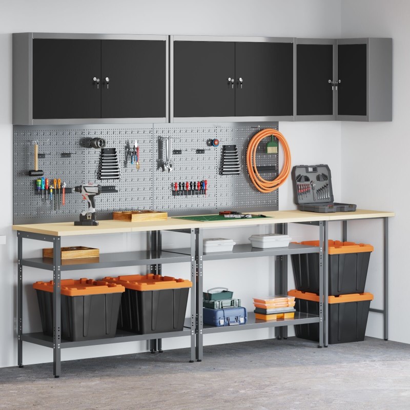 Dieser Werkzeugschrank sieht stilvoll aus und bietet viel Stauraum. Er besteht aus robusten Holzwerkstoffen und Stahl. Er eignet sich ideal für Werkstätten und Garagen, sorgt für ein professionelles und aufgeräumtes Erscheinungsbild und hält alle Werkzeuge griffbereit.