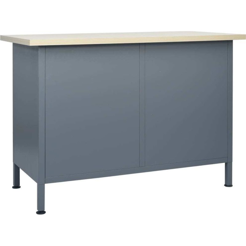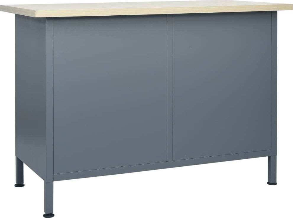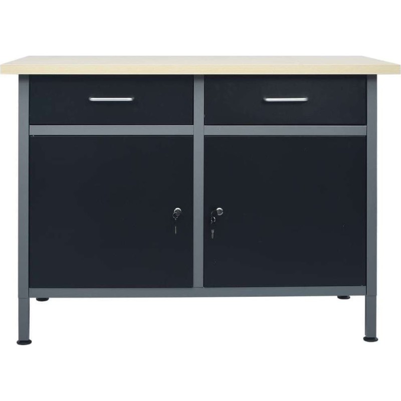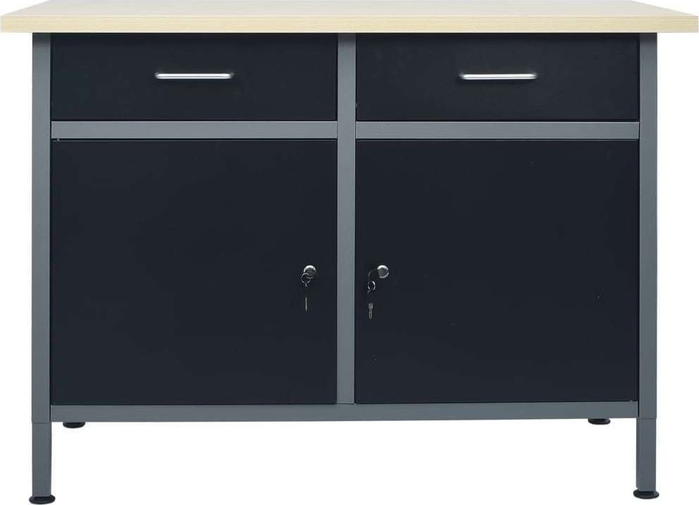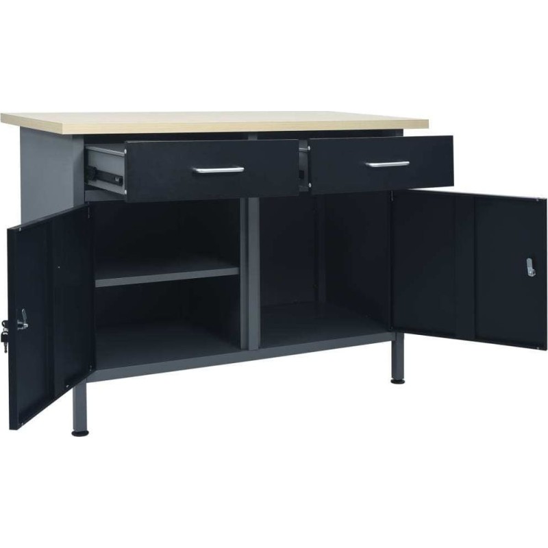 Die große und solide Arbeitsplatte bietet einen stabilen Untergrund für alle Reparaturarbeiten. Der Werkbanktisch verfügt über 2 Schubladen, sodass Sie Werkzeuge, Teile und Zubehör wie Schrauben, Nägel und Klebebänder gut ordnen können. Die Schubladen sind mit kugelgelagerten Führungen ausgestattet, um ein leichtgängiges Ausziehen zu gewährleisten. Das Möbelstück verfügt außerdem über geeignete Fächer für größere Werkzeuge und 2 Schränke mit verschließbaren Türen, in denen Bohrmaschinen, Kabel auf Trommeln und Schleifmaschinen bequem Platz finden.