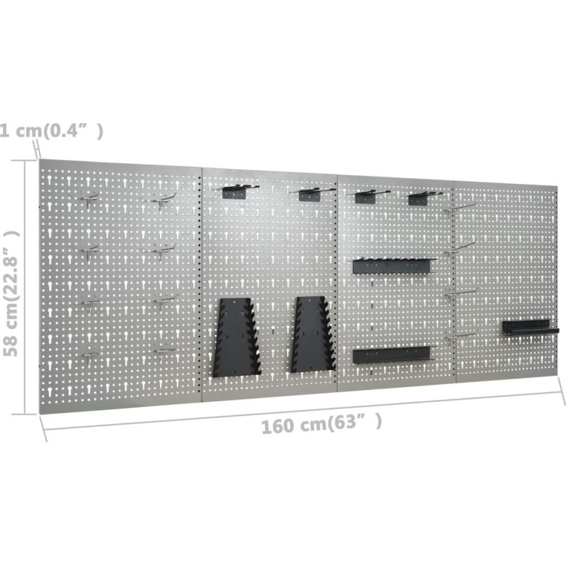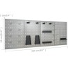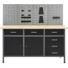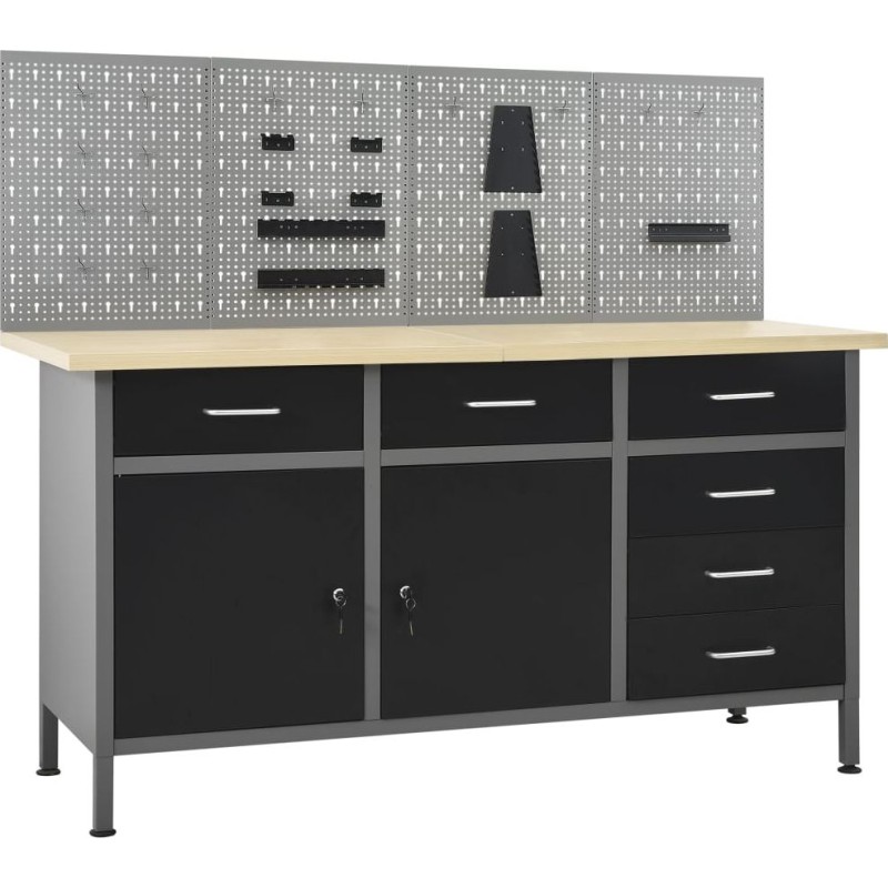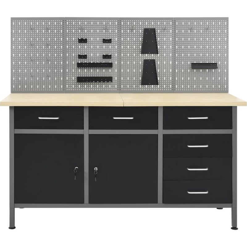 Dieses Set besteht aus 1 Arbeitstisch und 4 Wandpaneelen und bietet eine praktische Aufbewahrungslösung für die Werkstatt oder Garage. Der robuste Arbeitstisch zeichnet sich durch viel Stauraum und eine Tragkraft von 500 kg aus. Die große und stabile Arbeitsplatte bietet eine solide Arbeitsfläche für alle Reparaturarbeiten. Der Werkbanktisch verfügt über 6 Schubladen, um Werkzeuge, Teile und Zubehör wie Schrauben, Nägel und Klebeband ordentlich zu verstauen. Alle Schubladen sind mit kugelgelagerten Führungen ausgestattet, um ein leichtgängiges Ausziehen zu gewährleisten. Das Möbelstück verfügt über 2 Ablagefächer und einen großen Stauraum mit 2 abschließbaren Türen, in dem Bohrmaschinen, Kabeltrommeln und Schleifmaschinen problemlos Platz finden. Zudem sind die Füße höhenverstellbar. Diese Werkbank ist aus bestem Stahl und Spanplatten gefertigt, wodurch sie besonders robust, langlebig und leicht zu reinigen ist. Das Set ist einfach zu montieren. Die Werkzeugpaneele bestehen aus massivem Stahl, damit sie das Gewicht verschiedener Werkzeuge wie Bohrer, Zangen, Schraubendreher und Schraubenschlüssel tragen können. Die Platten sind perforiert, damit Werkzeuge einfach und sicher aufgehängt werden können. Die 4 Platten lassen sich miteinander verbinden, um ihre Stabilität zu erhöhen. Mit einer Breite von 160 cm ist dies die ideale Lösung für Ihren Arbeitstisch und Ihren Werkstattschrank.Werkbank:Farbe: schwarz, grauMaterial: Stahl, Spanplatte, MetalllegierungMaße: 160 x 60 x 85 cm (L x B x H)Plattenstärke: 3 cmMaximale Belastung: 500 kgMaximale Belastung einer einzelnen Schublade: 10–15 kg Mit 6 Schubladen auf Kugellagerschienen Mit 2 Schränken mit abschließbaren Türen Tischplatte mit holzähnlicher Maserung Höhenverstellbare Füße Montage erforderlich: ja WARNUNG: Um ein Umkippen des Produkts zu verhindern, müssen die mitgelieferten Befestigungselemente zur Wandmontage verwendet werden.Wandpaneel:Farbe: grau Material: StahlAbmessungen (Einzelstück): 40 x 58 x 1 cm (L x B x H)Metallstärke: 0,5 mmDurchmesser der kleinen Öffnung: 5,5 mmAbmessungen der Längsöffnung: 9,4 x 22,5 mm (B x H)Verschiedene ÖffnungenLieferumfang:1 x Werkbank4 x Wandpaneel21 x Befestigungszubehör...