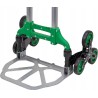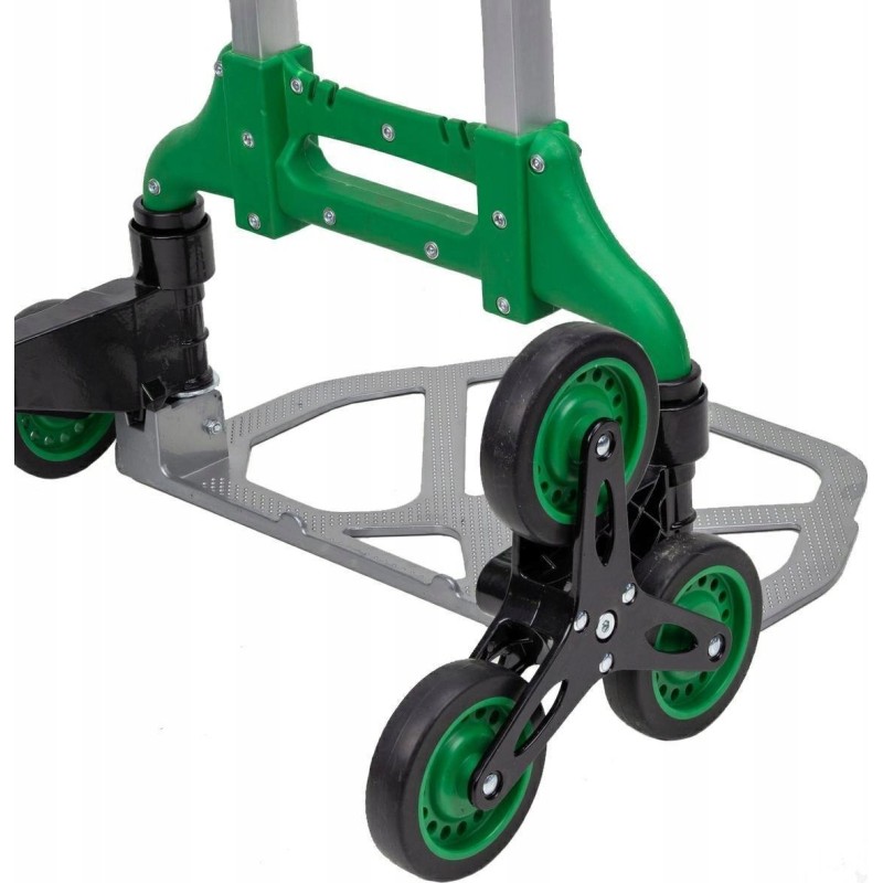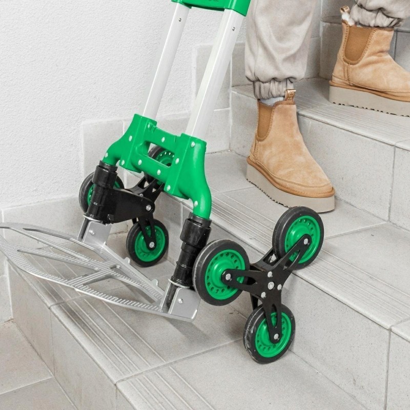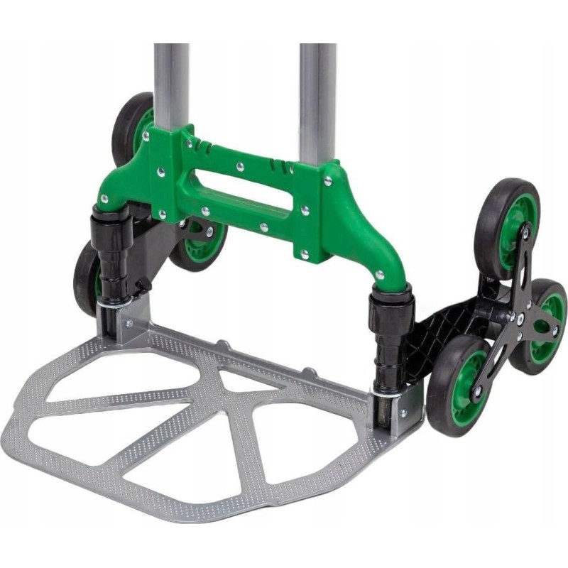 Transportwagen für den Transport von Gütern auf Treppen und ebenen Flächen, zusammenklappbar mit einer Grundfläche von 280 x 385 mm. Er hat eine Tragkraft von bis zu 80 kg auf ebenen Flächen und bis zu 40 kg auf Treppen.