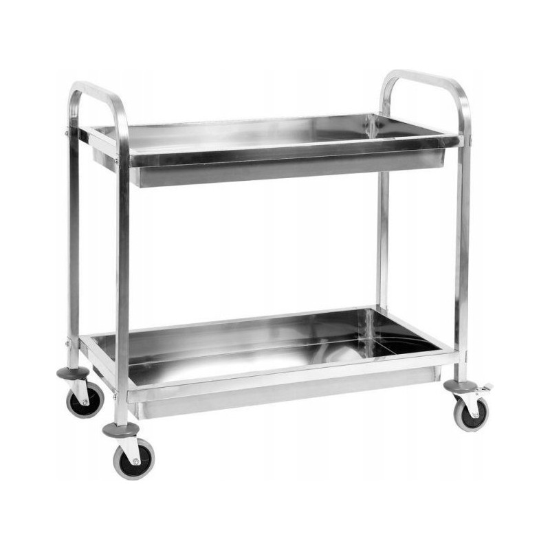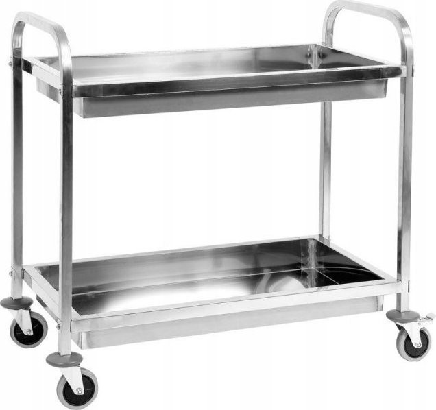 Servierwagen mit zwei tiefen Ablagen – YG-09099 Aus Edelstahl SS 201 gefertigt. Der Transportwagen der Marke YATO eignet sich für Restaurants, Hotels, Kantinen und andere Einrichtungen der Gemeinschaftsverpflegung sowie für Catering-Unternehmen und ermöglicht den bequemen Transport von Speisen, Geschirr und Zubehör. Er kann auch in Büros, Bibliotheken, Werkstätten oder Labors nützlich sein und ermöglicht den bequemen Transport verschiedener schwerer Gegenstände. Der Wagen wurde aus hochwertigem, langlebigem, korrosionsbeständigem und gleichzeitig leicht zu reinigendem Edelstahl SS 201 gefertigt. Der Wagen verfügt über 2 tiefe Ablagen mit den Maßen 82 x 43 cm und einer Tragkraft von bis zu 45 kg. Ein hoher Rand (9 cm) verhindert das Herunterrutschen der transportierten Gegenstände. An der Unterseite jeder Ablage befinden sich schalldämpfende Matten, die Vibrationen reduzieren. Der Wagen verfügt über 4 Lenkrollen aus TPR-Kunststoff, wodurch er wendig ist, leise rollt und den Bodenbelag nicht beschädigt. Jede Rolle ist mit einem Stoßfänger ausgestattet, zwei davon verfügen zudem über Feststellbremsen. Spezifikation Artikel Kellnerwagen mit 2 tiefen Ablagen Artikelnummer YG-09099 Artikelzustand Neu Material Edelstahl SS201 Anzahl der Ablagen 2 Abmessungen einer Ablage 82 x 43 cm Tiefe der Ablage 9 cm Tragkraft einer Ablage bis zu 45 kg Abstand zwischen den Ablagen 50 cm Schalldämmmatten Ja Material der Rollen Thermoplastischer Gummi (TPR) Rollentyp Lenkrollen mit Kugellagern Bremsen Zwei Rollen mit Bremsen Abmessungen (LxBxH) 95 x 50 x 95 cm Gewicht 10,4 kg Im Lieferumfang enthalten: Servierwagen Montagezubehör Bedienungsanleitung