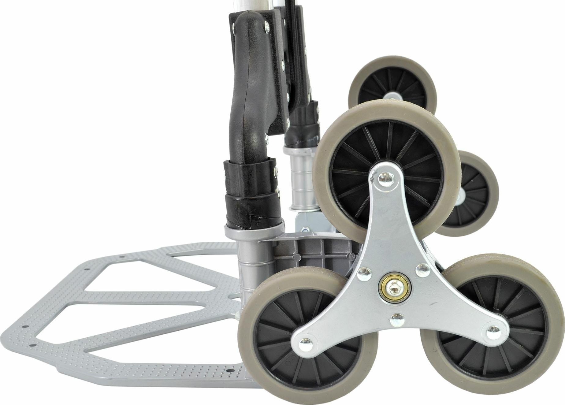 Dreifach gummierte Räder sorgen für leichtes Bewegen auf jedem Untergrund, einschließlich Treppen oder Stufen. Die
