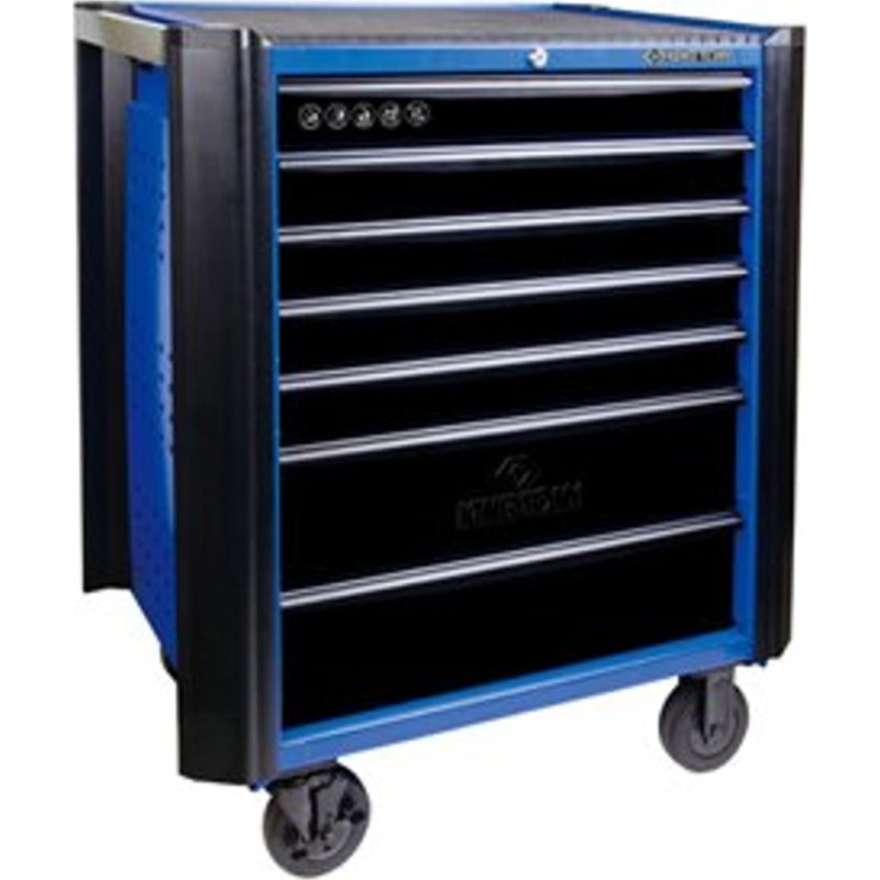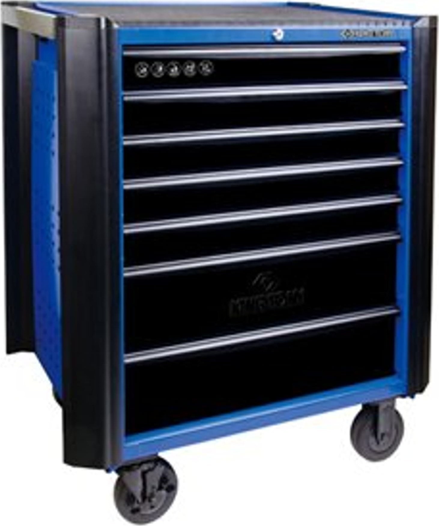 King Tony Werkzeugwagen – WERKSTATTWAGEN MIT SCHUTZLEISTEN, 7 SCHUBLADEN (OHNE WERKZEUGE) – BLAU + SCHWARZE SCHUBLADEN, FÜHRUNGSSCHIENEN