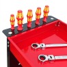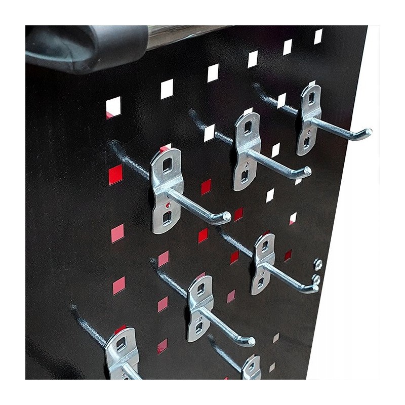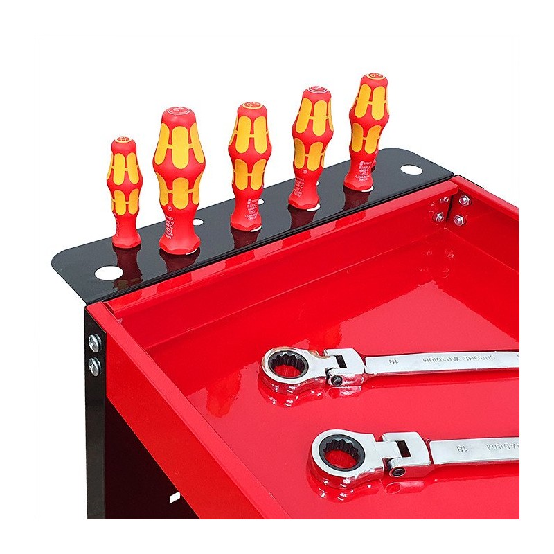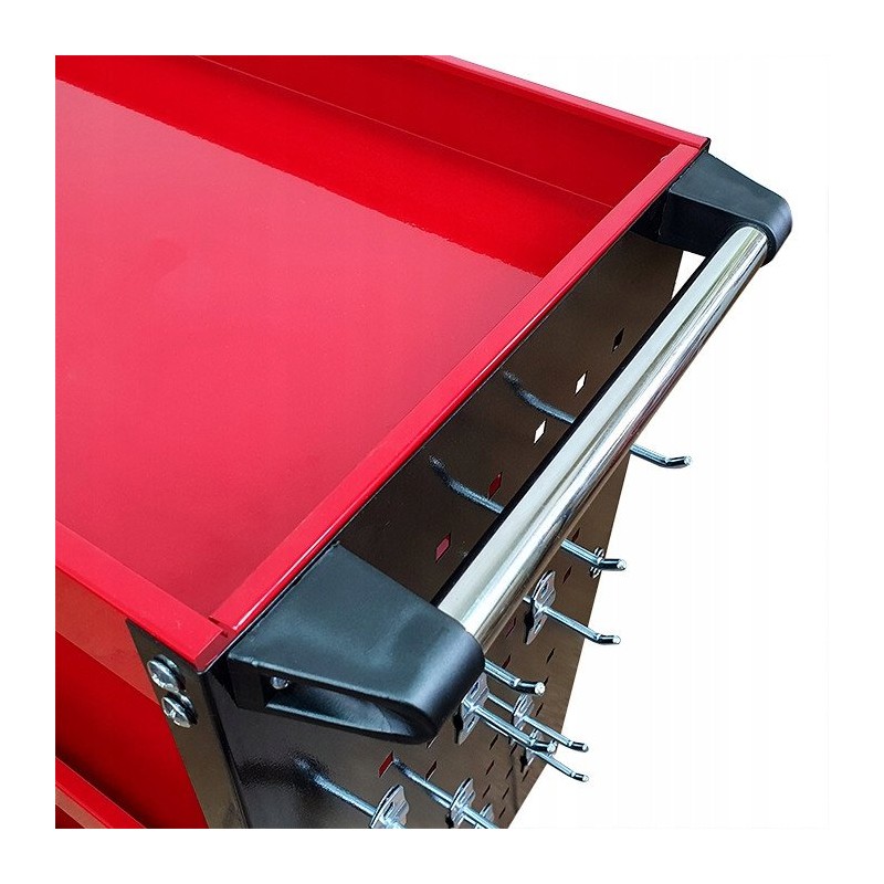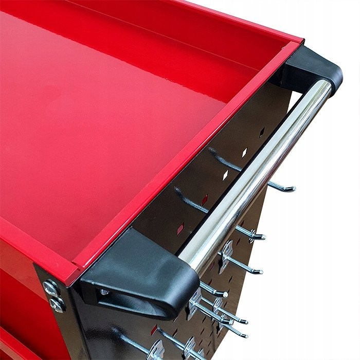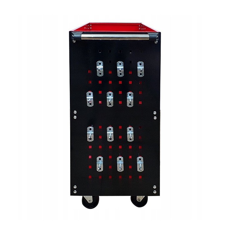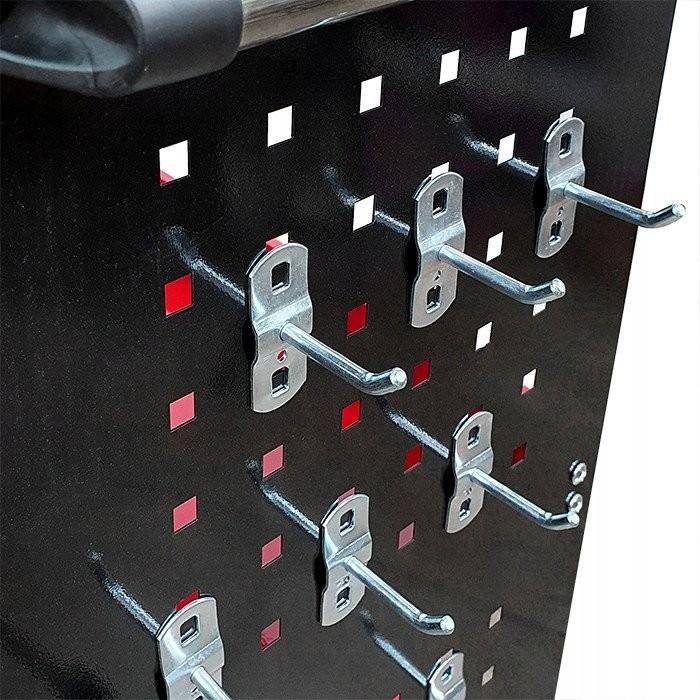 Der Wagen ist mit einer praktischen Halterung für Schraubendreher sowie Seitenwänden mit 12 Haken ausgestattet, was eine einfache und bequeme Aufbewahrung der Werkzeuge ermöglicht. So sind alle notwendigen Zubehörteile immer griffbereit, was die Arbeit erheblich beschleunigt.