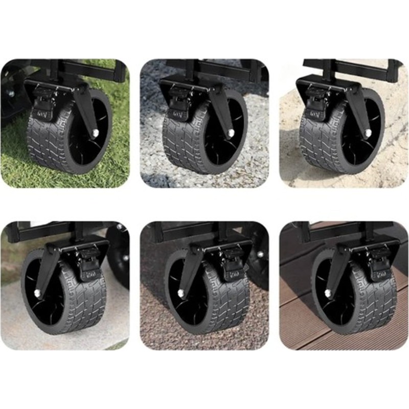 Der Wagen zeichnet sich durch eine beeindruckende Tragkraft von 100 kg aus, was den Transport schwerer Lasten ohne Beschädigungsrisiko ermöglicht. Seine verstärkte Konstruktion macht ihn zu einem äußerst langlebigen und witterungsbeständigen Produkt.