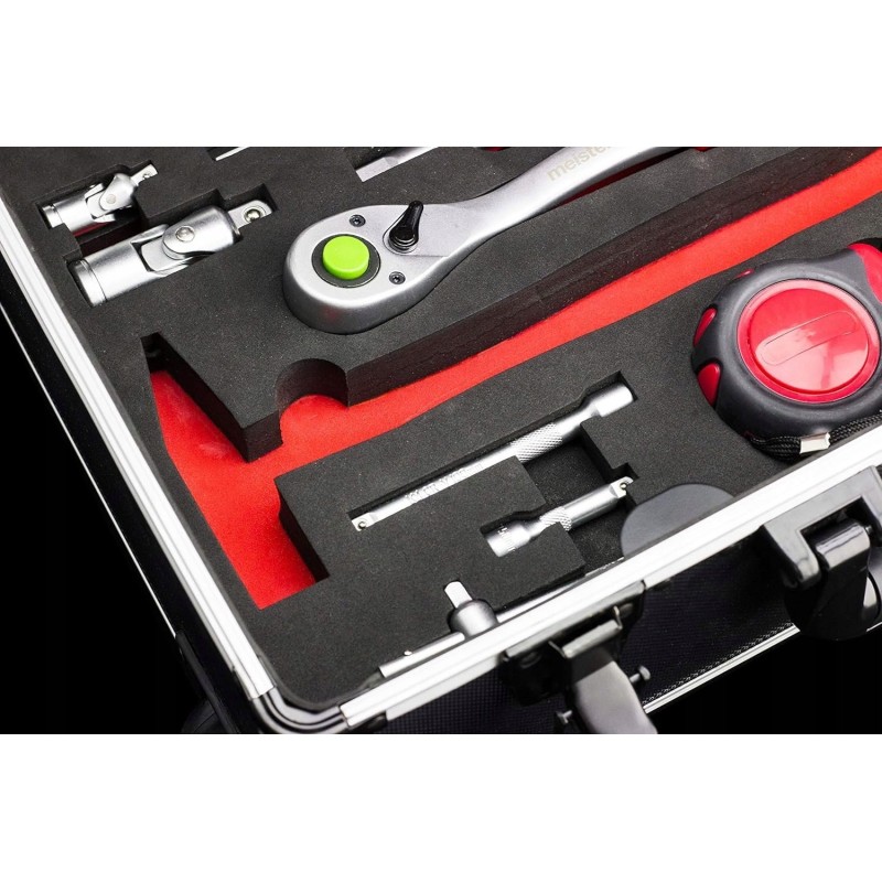 Hochwertiger Aluminiumkoffer mit abgerundeten Kanten und verstärkten Ecken. Ein praktischer ausziehbarer Griff und integrierte Rollen sorgen für einen reibungslosen Transport. Ihre Werkzeuge sind stets ordentlich verstaut und leicht zugänglich – sicher und bequem aufbewahrt.