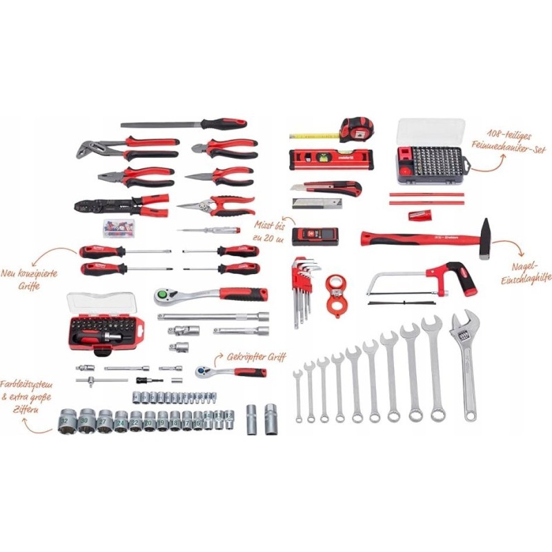 Das 238-teilige Meister-Werkzeugset bietet dir Werkzeuge für alle deine Bedürfnisse. Darin findest du hochwertige Handwerkzeuge wie Schraubendreher, Steckschlüssel, einen Schlosserhammer, eine Wasserwaage und Zangen. Egal, ob Sie in der Werkstatt, in der Garage oder zu Hause arbeiten – dieses Set bietet Ihnen Werkzeuge für verschiedene Anwendungen, von der Feinmechanik bis zur Montage.