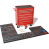 Der mobile Werkzeugwagen mit 7 Schubladen ist mit einem Werkzeugset für Kfz-Mechaniker ausgestattet.