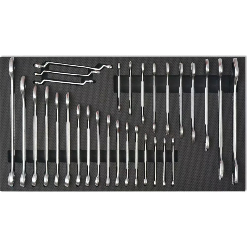 • 10 x Gabelschlüssel: 6–7, 8–9, 10–11, 12–13, 14–15, 16–17, 18–19, 20–22, 24–27 und 30–32 mm