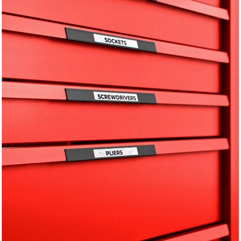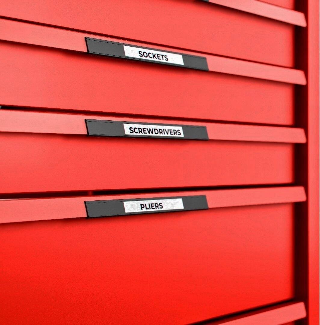 Das TengTools-Werkzeugkontrollsystem ermöglicht eine übersichtliche Aufbewahrung, was den schnellen Zugriff auf die benötigten Werkzeuge erheblich erleichtert. Die schmalen Aluminiumgriffe der Schubladen bieten Platz für Etiketten, was die Identifizierung ihres Inhalts zusätzlich erleichtert.