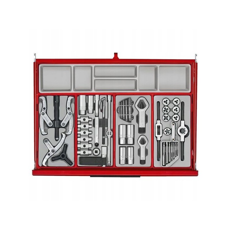 Der Werkzeugwagen TKS26R1033T PRO35TM ist mit einem mobilen, mehrstöckigen Werkzeugschrank mit 16 Schubladen ausgestattet. Jede Schublade hat eine Tragkraft von 30 bis 40 kg und ist mit Kugelführungen ausgestattet, was ein sanftes Öffnen und Schließen gewährleistet. Die Mobilität des Sets wird durch 5-Zoll-Rollen erleichtert, darunter zwei Lenkrollen mit Bremse und zwei Bockrollen, was das Manövrieren extrem einfach macht.