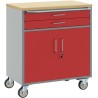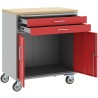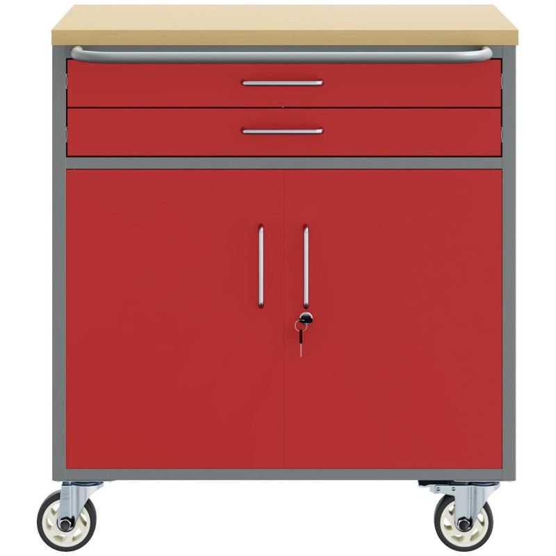 Dieser Werkzeugschrank auf Rollen wurde aus Stahl und Holzwerkstoff gefertigt und verbindet Funktionalität mit industriellem Stil. Seine attraktive Farbgebung in Rot und Grau sticht wirklich hervor und ist gleichzeitig praktisch, was ihn zu einer großartigen Ergänzung für jeden Arbeitsbereich macht.