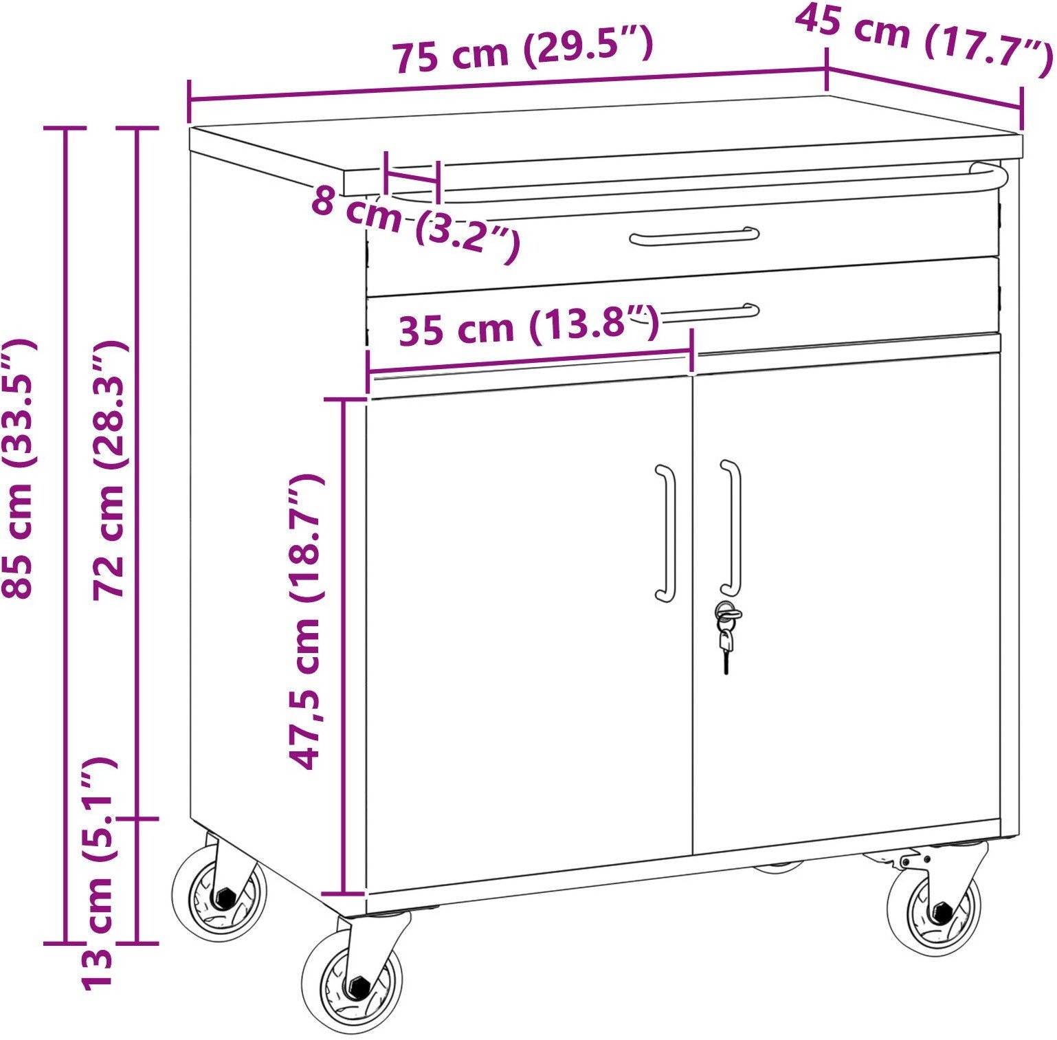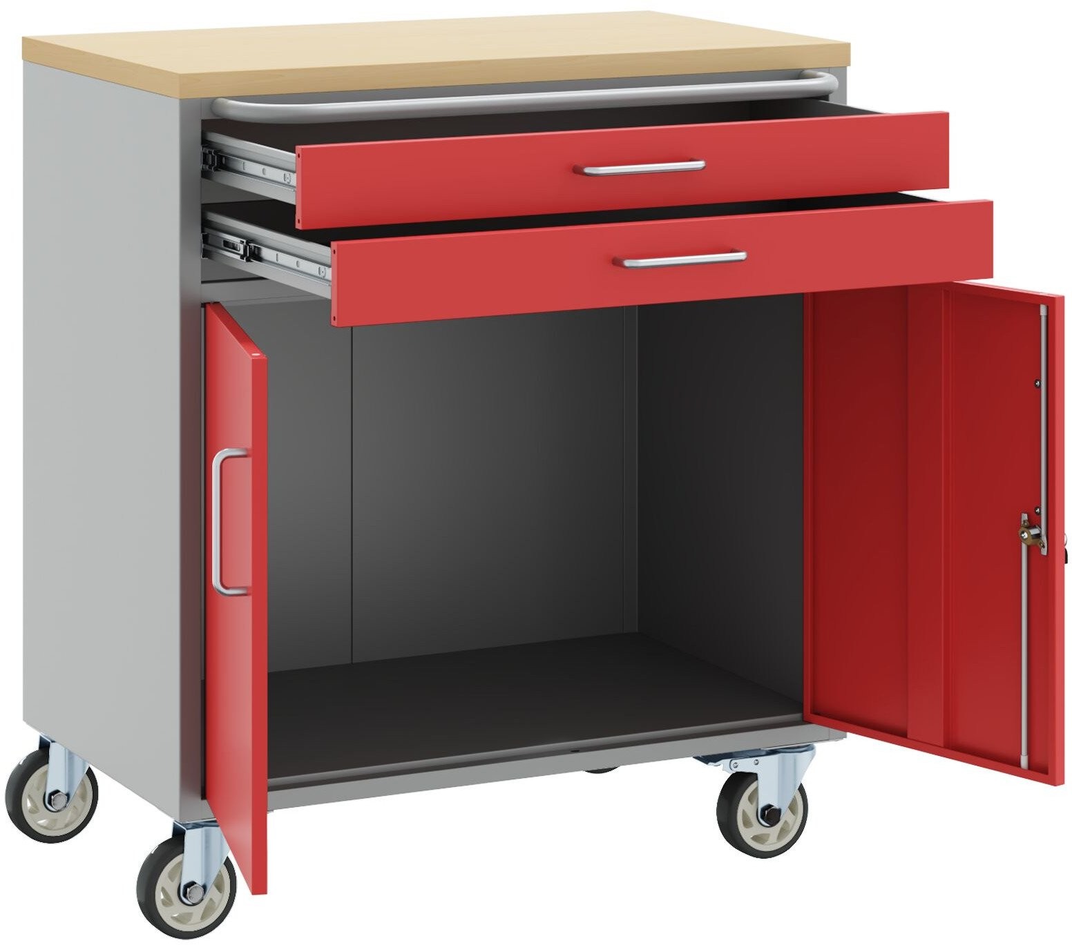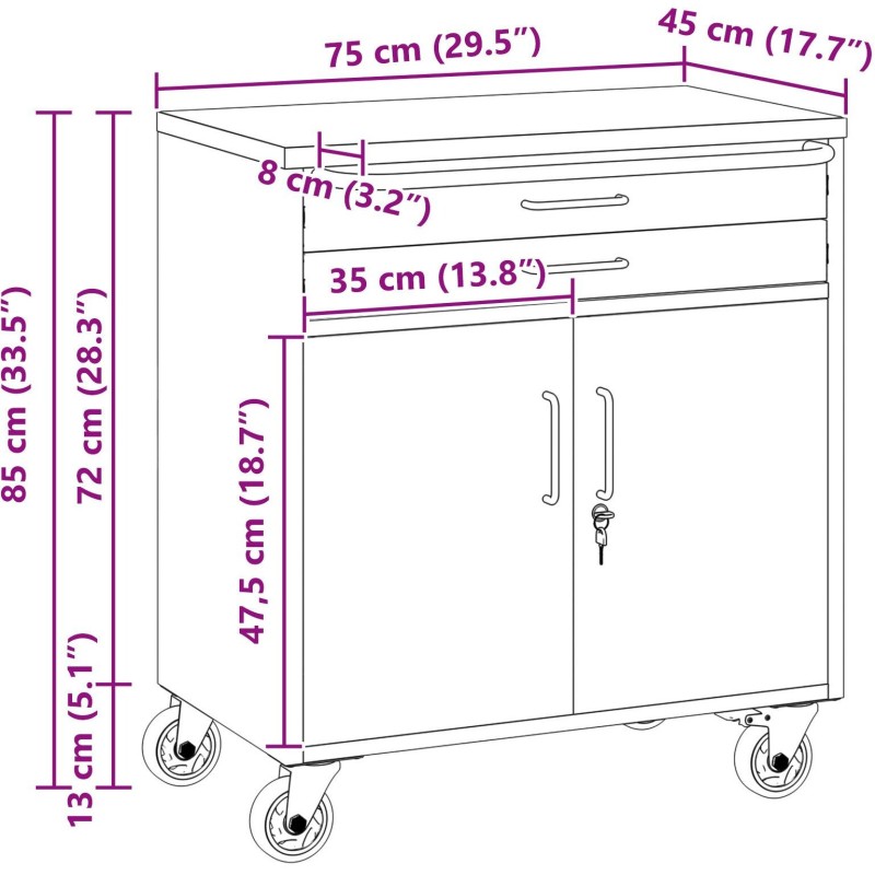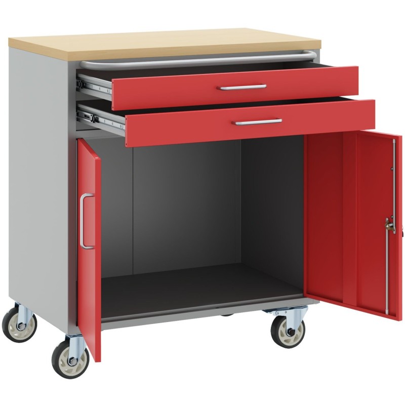 • Großer Stauraum: Er verfügt über zwei abschließbare Türen und zwei Schubladen mit Kugellagern, sodass du reichlich Platz für Werkzeuge hast – von kleinen bis hin zu größeren Utensilien findet alles seinen Platz.