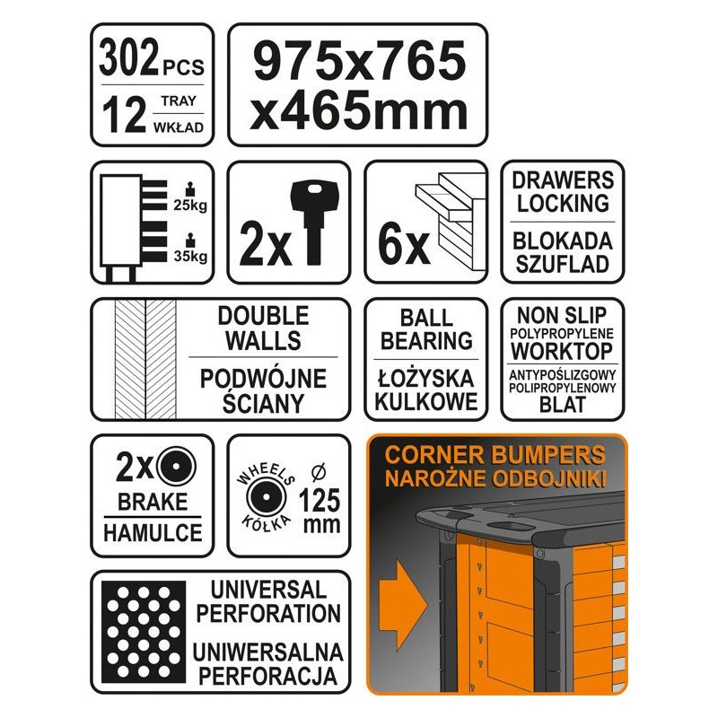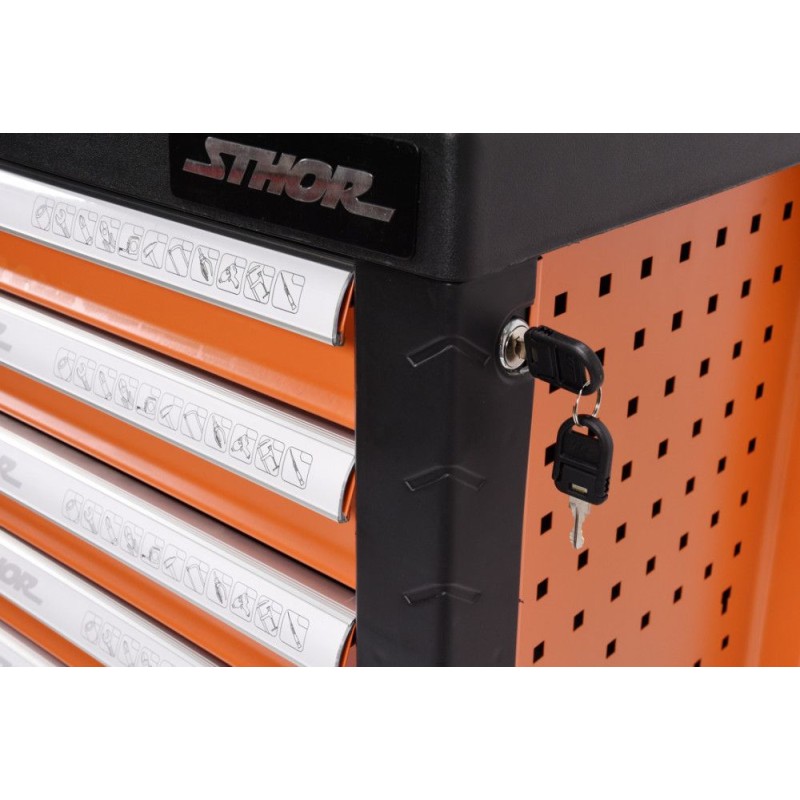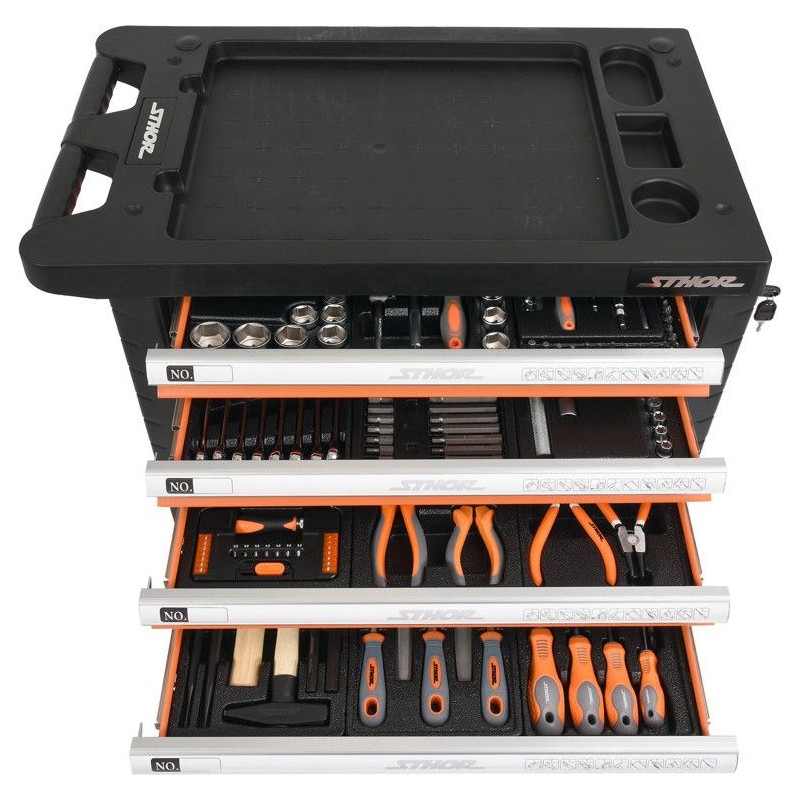 Der STHOR-Werkzeugwagen enthält 302 speziell ausgewählte Werkzeuge. Die Rahmen des Wagens bestehen aus Stahlblech. Zentralverriegelung sowie Einzelverschlüsse für jede Schublade. Werkzeuge aus CrV-Stahl. Der Wagen verfügt über Eckpuffer, die vor versehentlichen Beschädigungen, z. B. an der Karosserie eines Autos, schützen. Die Arbeitsplatte besteht aus strapazierfähigem Polypropylen.