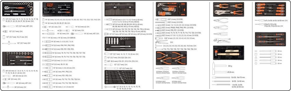 Bits 3/8" L=70 mm: H4, H5, H6, H7, H8, H10, H12; M5, M6, M7, M10, M12; T20, T25, T30, T40, T45, T50, T55; RM5, RM6, RM7, RM8, RM10, RM12