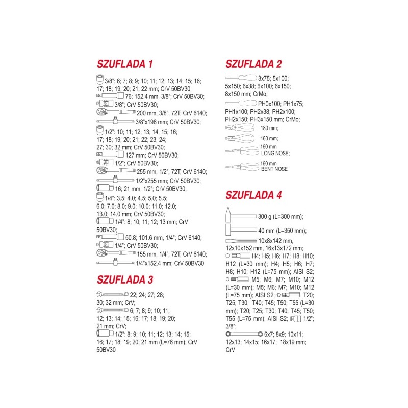 Dieser Wagen verfügt über verschiedene nützliche Zubehörteile von guter Qualität, die sofort nach dem Auspacken einsatzbereit sind. Da er bereits ausgestattet ist, müssen Sie keine Schraubenschlüssel, Steckschlüsseleinsätze und viele andere Werkzeuge, die Sie in Ihrer Werkstatt benötigen, zusätzlich kaufen.