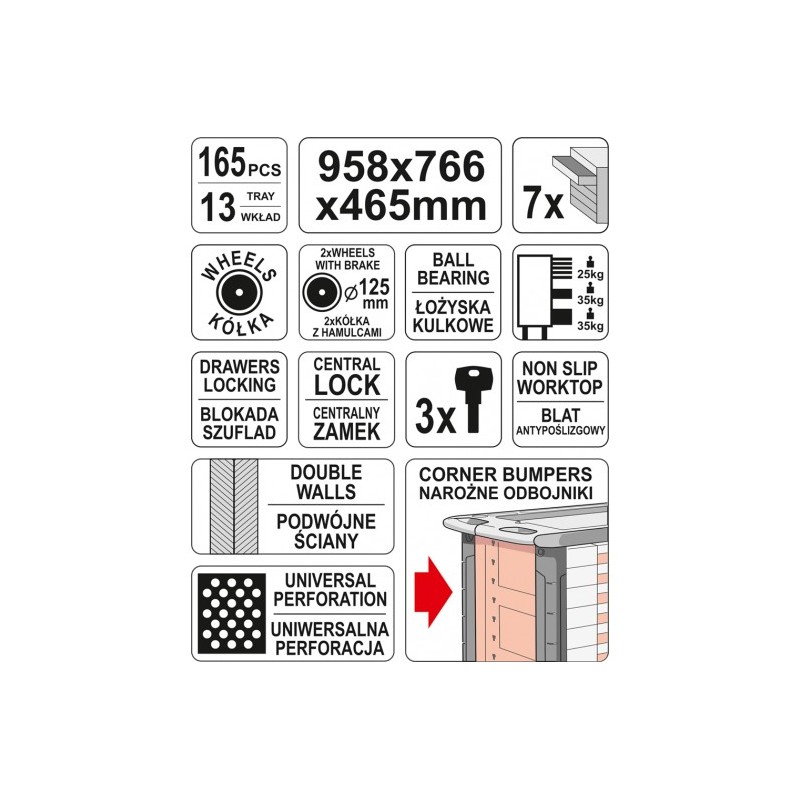 Der geräumige und funktionale Werkzeugwagen bietet die Möglichkeit, alle notwendigen Werkzeuge an einem Ort unterzubringen, und sorgt gleichzeitig für eine gute Sortierung – Sie greifen schnell nach dem richtigen Teil und führen die Reparatur präzise durch. Diese Lösung spart Ihnen viel Zeit – Sie verschwenden keine Zeit damit, in der Werkstatt nach den gewünschten Produkten zu suchen, und alle Aufgaben lassen sich blitzschnell erledigen.