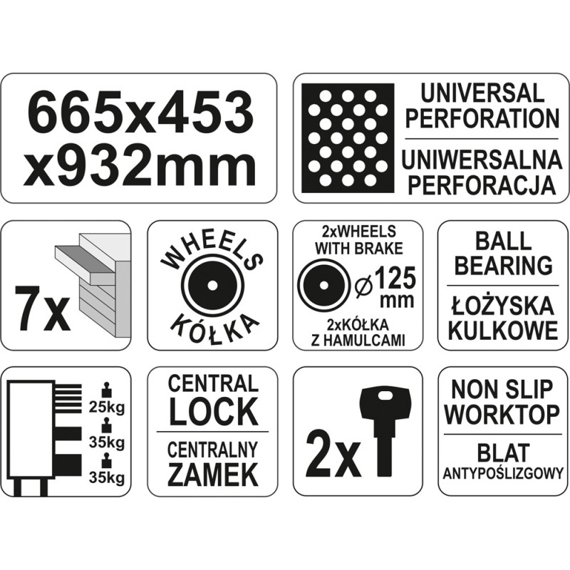 Der moderne Werkzeugwagen zeichnet sich durch hohe Belastbarkeit und hervorragende Widerstandsfähigkeit aus, da er aus robustem Stahlblech gefertigt ist. Darüber hinaus ist das pulverbeschichtete Möbelstück perfekt vor Korrosion geschützt – eine lange Lebensdauer des Produkts ist garantiert. Zudem erleichtert die an den Kanten angebrachte Perforation den Zugriff auf die nützlichsten Zubehörteile – Sie müssen sie nur daran aufhängen. Diese Lösung gewährleistet eine reibungslose Durchführung jeder Reparatur, und die Werkzeuge sind immer griffbereit.