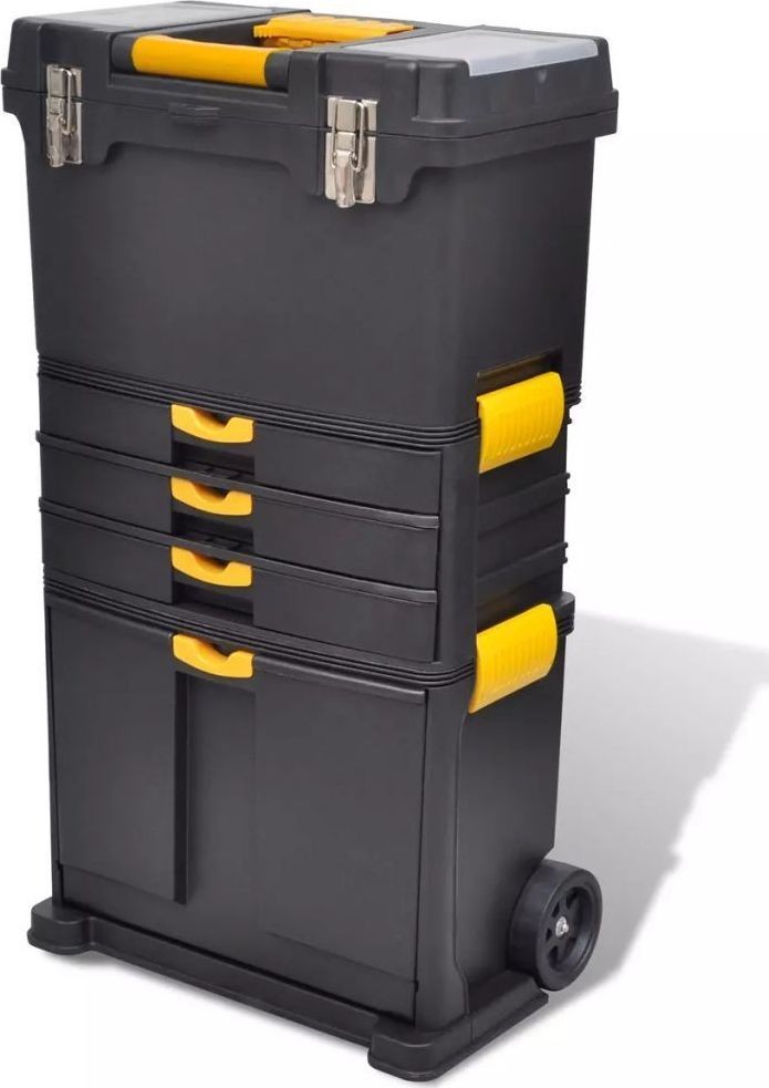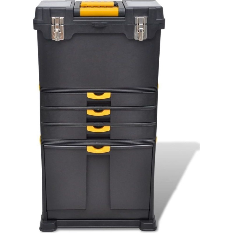 Sowohl der obere als auch der untere Kasten sind geräumig genug, um große Werkzeuge aufzunehmen, während die 3 Schubladen im mittleren Teil über Inneneinteilungen verfügen, mit denen Sie kleine Werkzeuge und Teile wie Schrauben und Muttern sortieren können. Dank der seitlichen Verschlüsse kannst du einen Teil leicht abnehmen, wenn du nur den oberen Koffer mitnehmen möchtest.