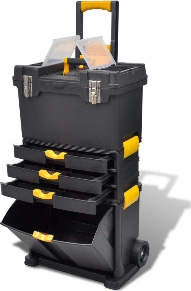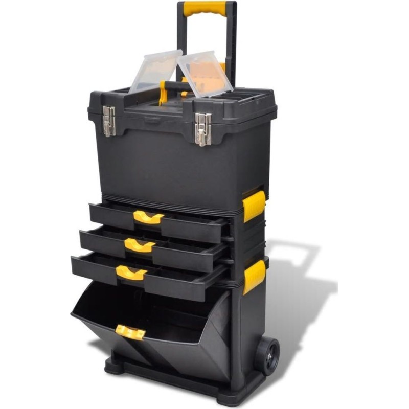 Dieser hochwertige Werkzeugkoffer, ausgestattet mit 2 Rollen und einem Griff, ist die ideale Wahl, um Werkzeuge und Ausrüstung während des Transports zu schützen oder besser aufzubewahren. Ausgestattet mit einem oberen und unteren Kasten sowie einem mittleren Teil mit 3 Schubladen garantiert Ihnen dieser robuste Werkzeugwagen viel Stauraum und hilft Ihnen sicher dabei, Ihre Werkzeuge ordentlich zu halten, was Ihnen in Zukunft viel Komfort bieten wird.