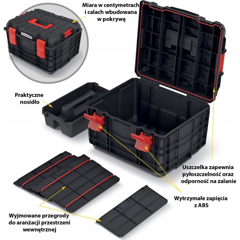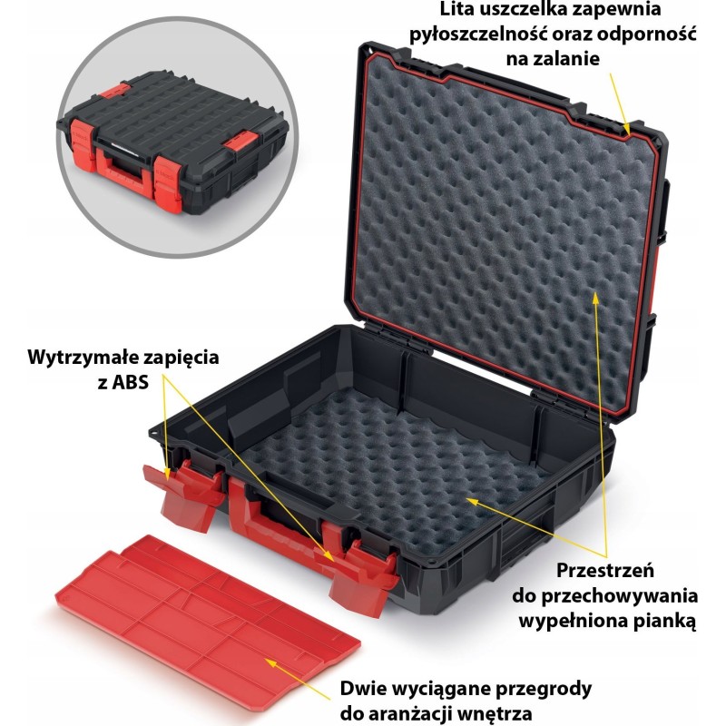 Alle Kisten sind mit einem massiven, abdichtenden Deckel ausgestattet, was einen hohen Grad an Staubdichtigkeit gewährleistet. Dies ist besonders wichtig, wenn Elektrowerkzeuge aufbewahrt werden oder bei Regen.