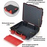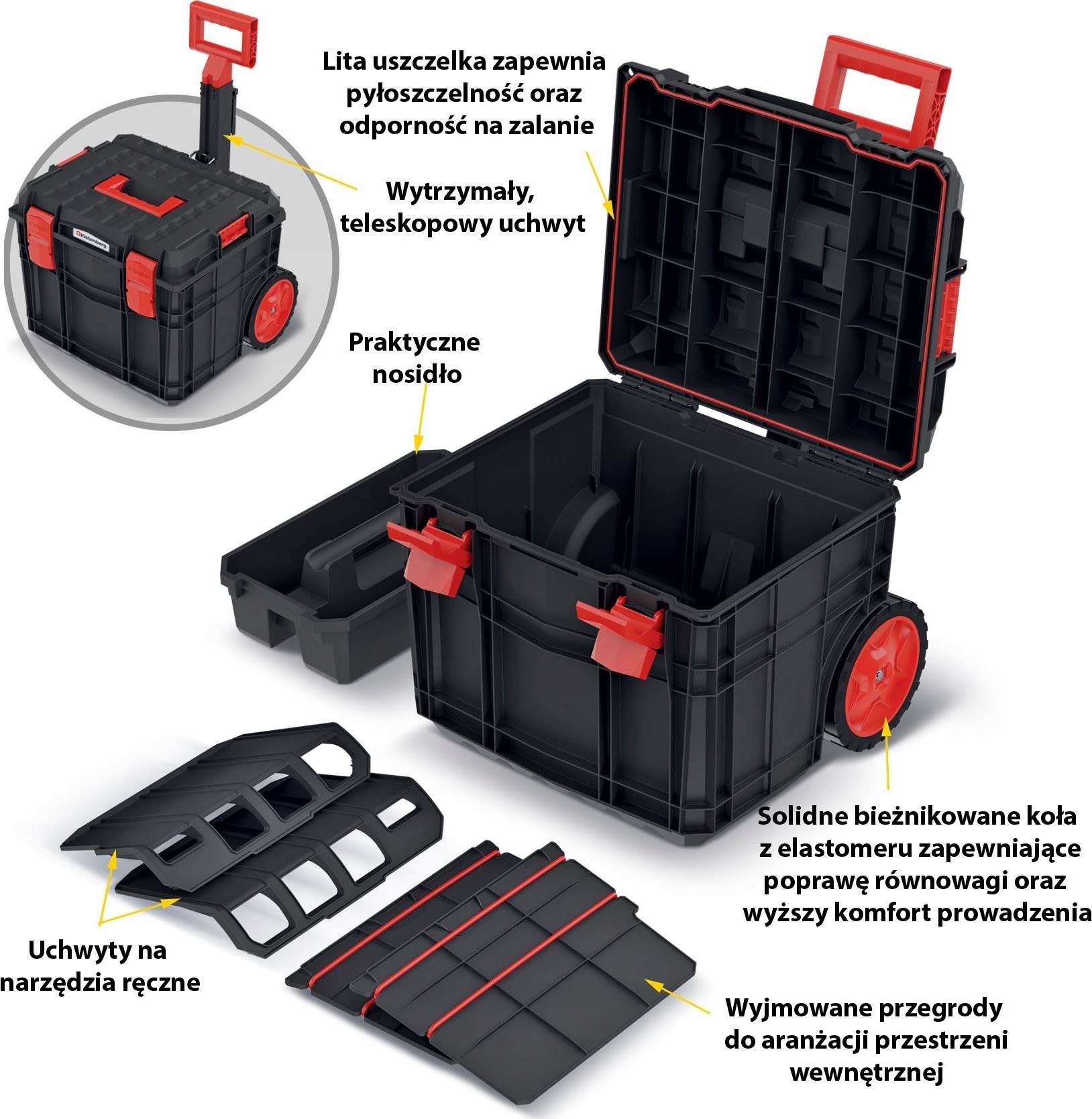 Zwei praktische Halterungen sorgen dafür, dass die wichtigsten Werkzeuge immer griffbereit sind. Der bequeme und lange Griff gewährleistet einen sicheren Halt für jede Männerhand. Spezielle Noppen im Korpus der Kisten verhindern, dass sich die Halterungen beim Transport verschieben.