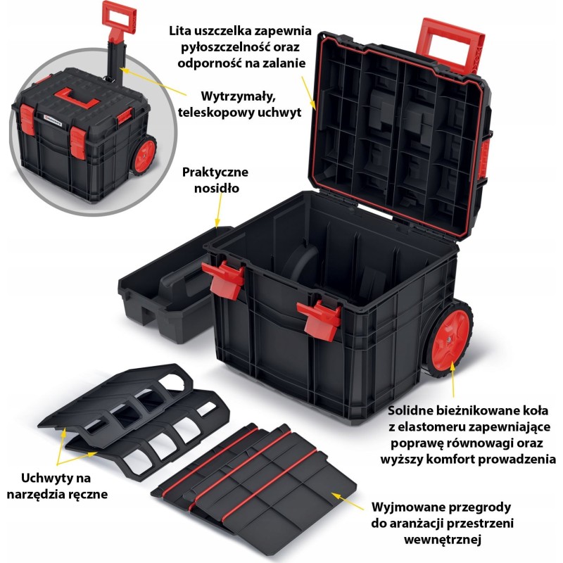 Eine hohe Kompatibilität aller Elemente wurde zudem durch Deckel mit 2 Steckverbindern erreicht, die eine Verbindung mit anderen Kisten und Rollwagen der Serien