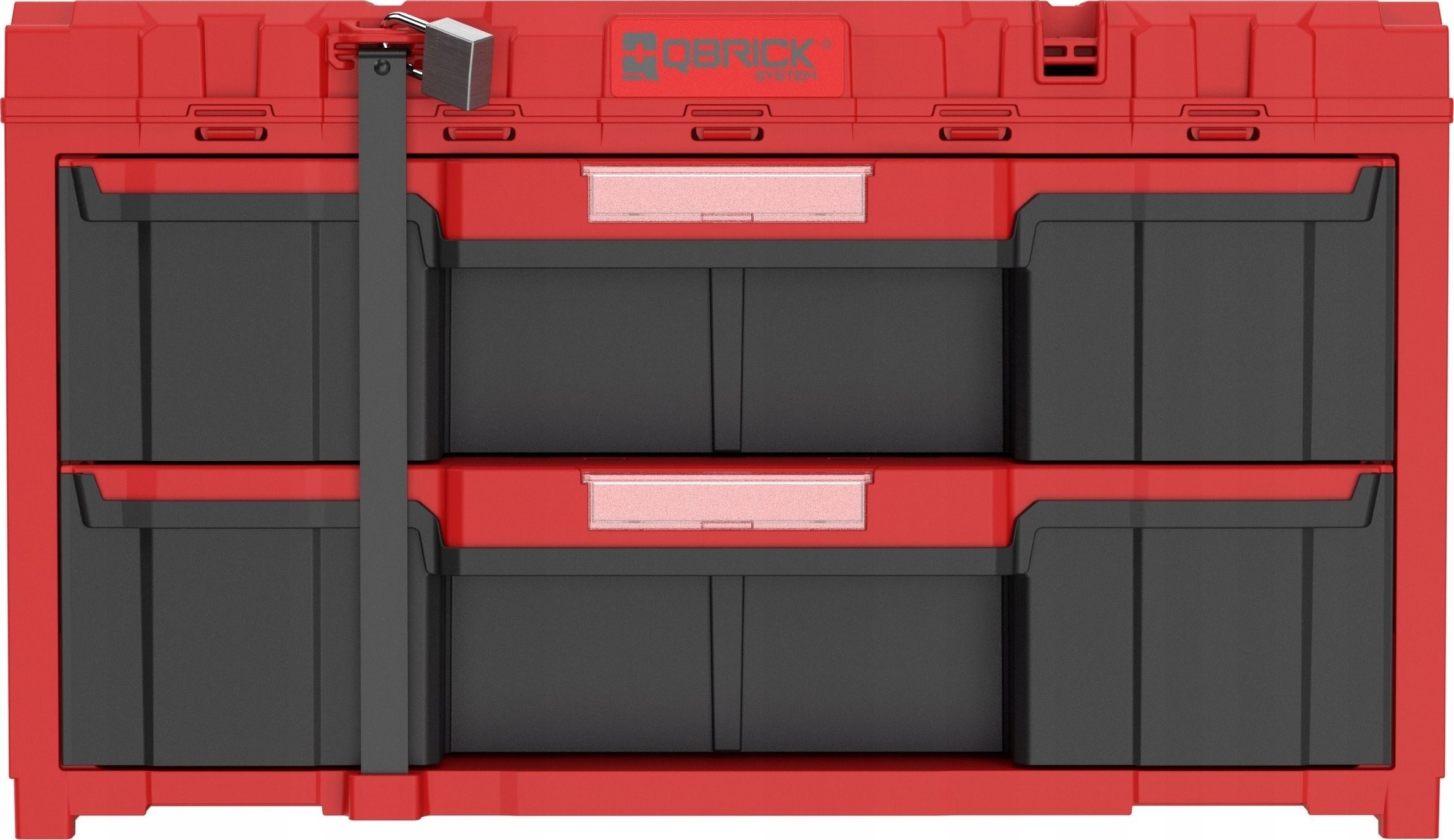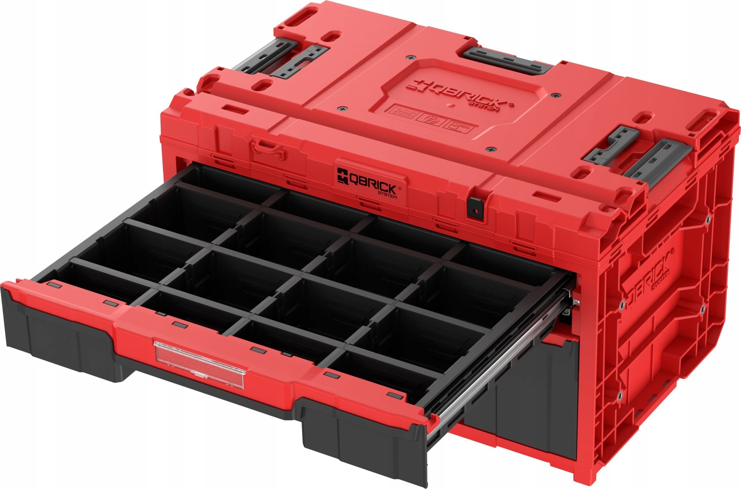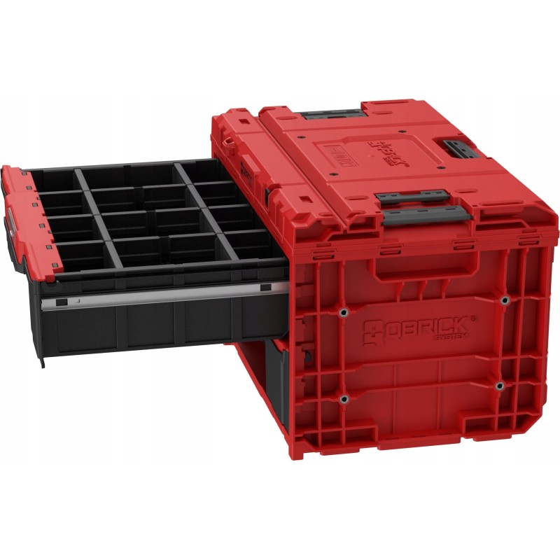 Der Schrankkörper ist nach dem bekannten Qbrick ONE 2.0-Schema gefertigt, mit einem stark gerippten Muster und einem extrem robusten Deckel, auf den man problemlos Gegenstände stellen kann. In der ROTEN Version kommt ein extrem widerstandsfähiger Kunststoff zum Einsatz, der den rauen Bedingungen auf Baustellen standhält. Die Schublade selbst ist zwar nicht rot, besteht jedoch aus ABS-Kunststoff – einem technischen Kunststoff mit hoher Steifigkeit und Härte, was sich deutlich auf den Schubladenboden auswirkt, der sich unter Belastung nicht verformt. Der ROTE Kunststoff und das ABS sind durch solide dreiteilige Schienen verbunden. Ihre Konstruktion sorgt für eine angemessene Abstützung des vollständig ausgezogenen Fachs und garantiert so Zuverlässigkeit auf weltweit höchstem Niveau.
