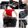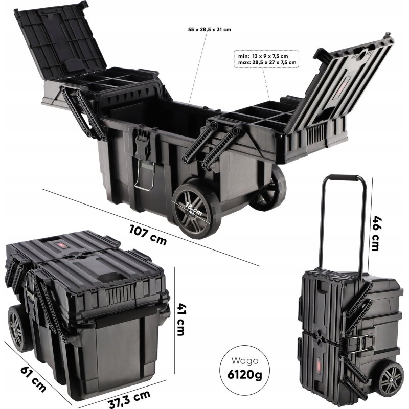 Dadurch öffnet sich die Kiste nicht bei rauer Fahrt oder schnellem Transport. Darüber hinaus sorgt der praktische Teleskopgriff dafür, dass Sie die Kiste transportieren können, ohne sich bücken zu müssen. Im geräumigen Innenraum können Sie alle notwendigen Werkzeuge aufbewahren – und haben sie griffbereit!