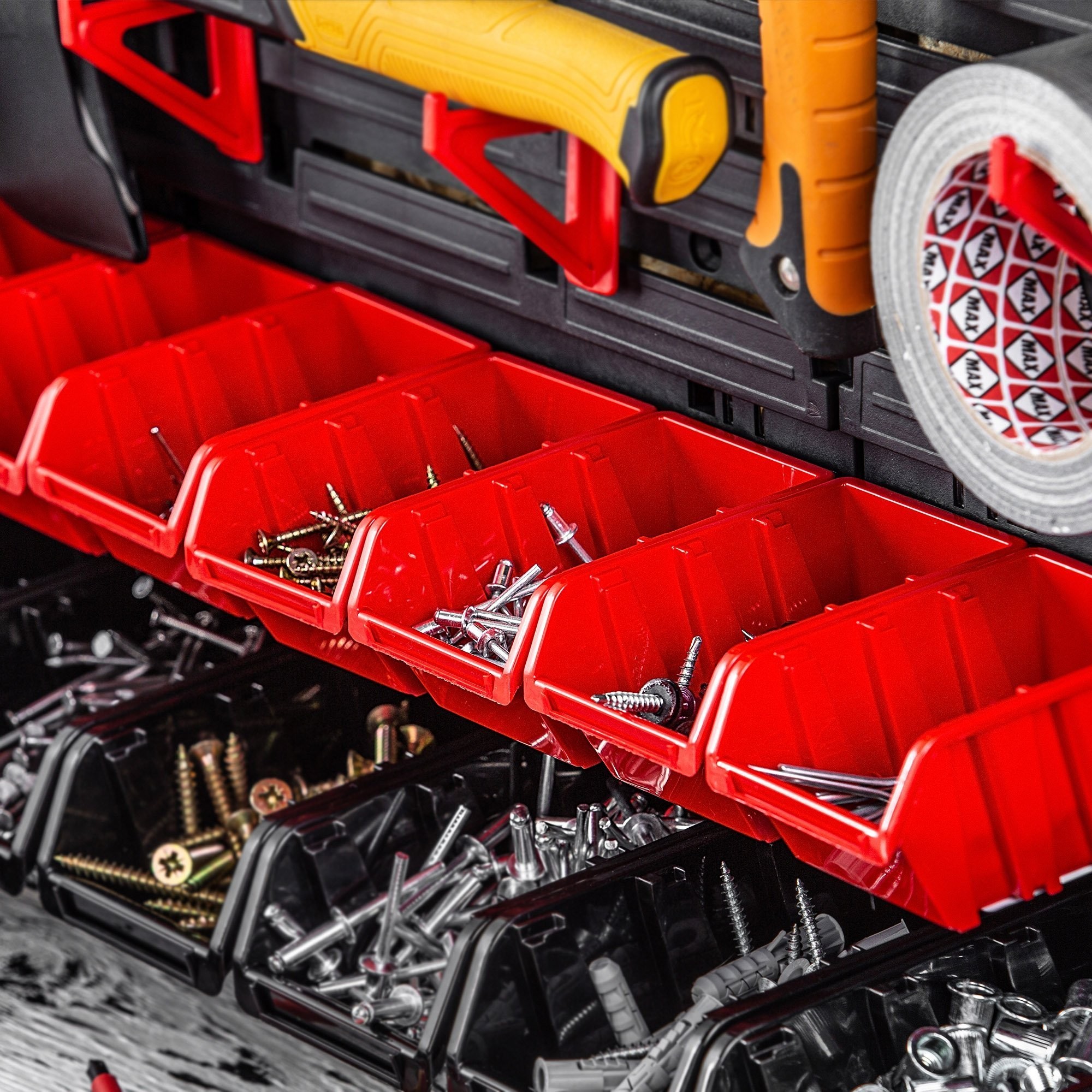 MODULARER AUFBAU – Die Werkzeugwand ist modular aufgebaut, sodass Sie das Zubehör frei anordnen und um weitere Elemente erweitern können. Sie können daran sowohl Werkstattkisten als auch Regale und Werkzeughalter aufhängen.