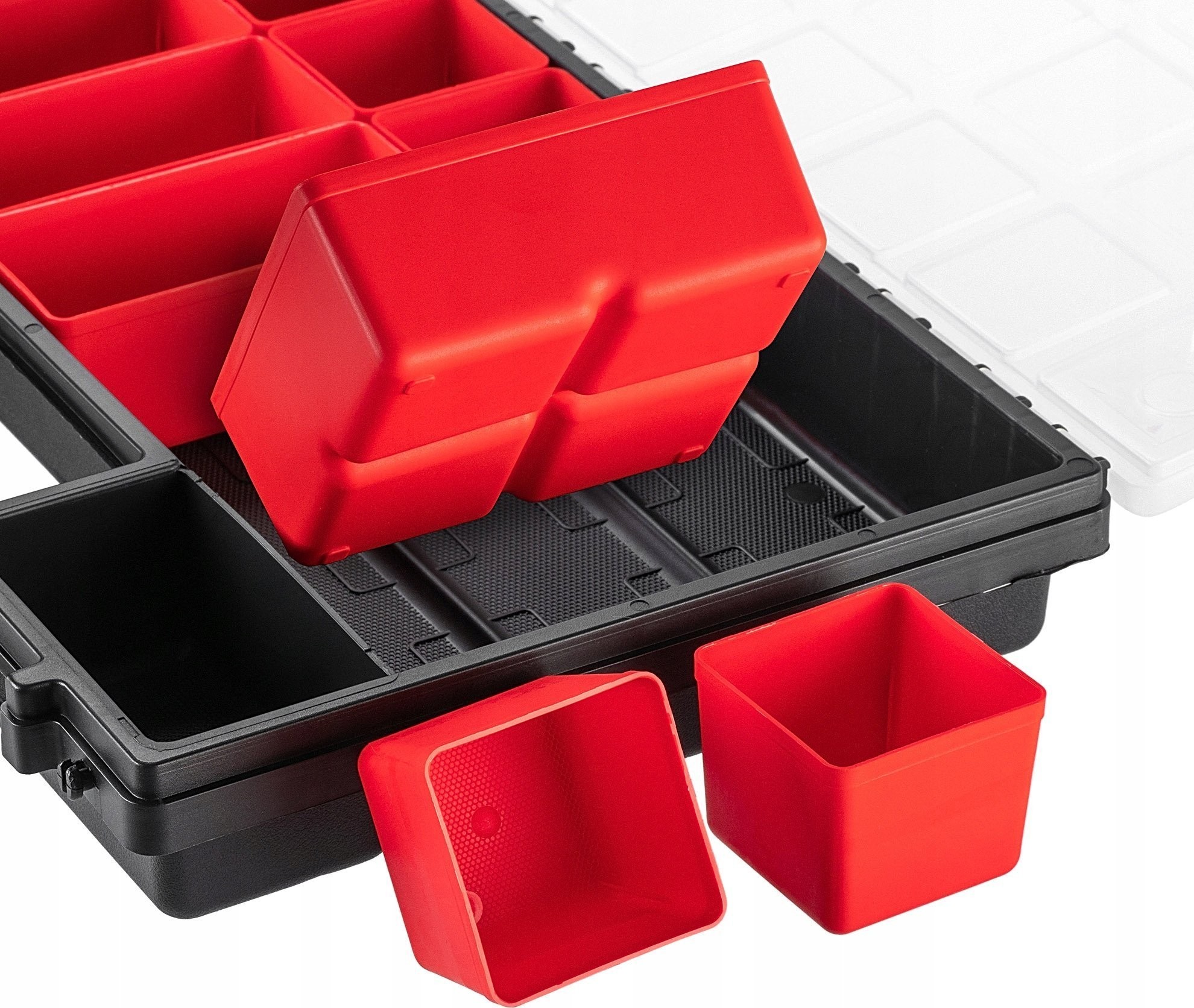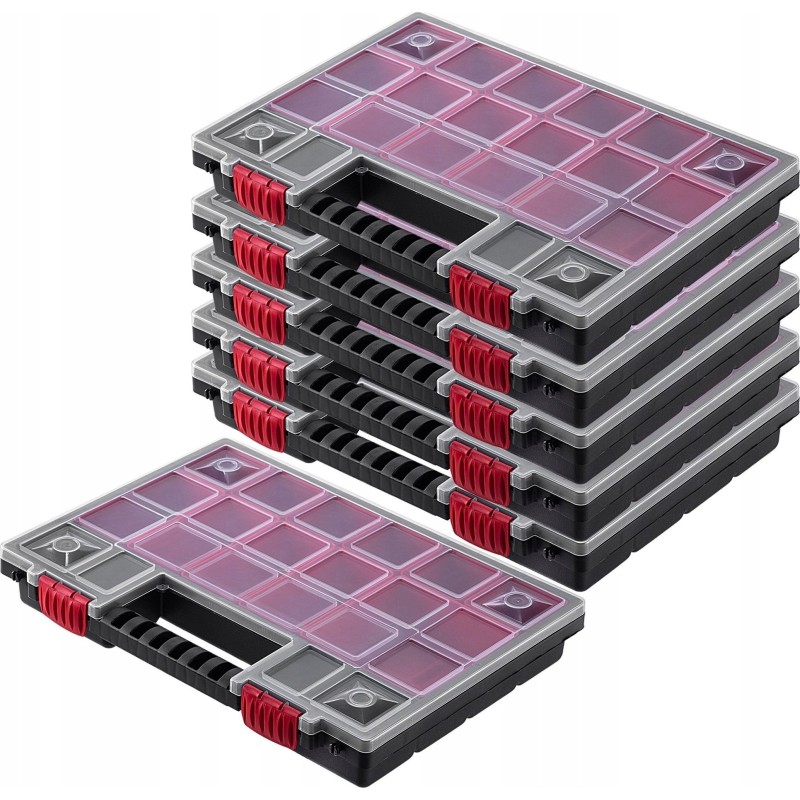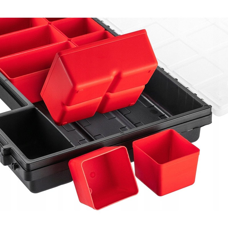 ROBUST – Der Korpus und der transparente Deckel bestehen aus robustem Kunststoff. Der Werkzeugorganizer verfügt über stabile Verschlüsse, die den Deckel sichern und den Inhalt zuverlässig vor unerwartetem Herausfallen schützen.