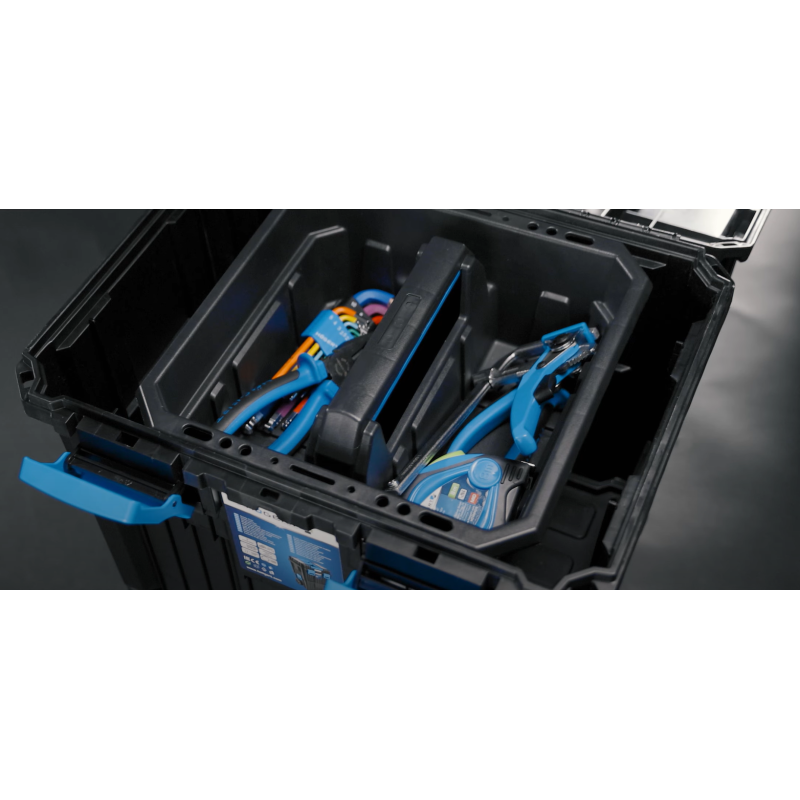 2-teiliger, modularer, mobiler Werkzeugkasten. Zwei unabhängige, geräumige Module mit herausnehmbarem Tragegriff ermöglichen die übersichtliche Aufbewahrung und den Transport von bis zu 30 kg Werkzeugen. Die kompakten Abmessungen und die Möglichkeit, die Module auseinanderzunehmen, ermöglichen den Transport im Auto und die Lieferung fast bis direkt an den Arbeitsplatz. Dadurch eignet er sich hervorragend für Dienstleistungsunternehmen, Kfz-Werkstätten sowie für die Garage jedes Heimwerkers. Die ideale Lösung für Profis, die Wert auf Mobilität, Sicherheit und Flexibilität legen.