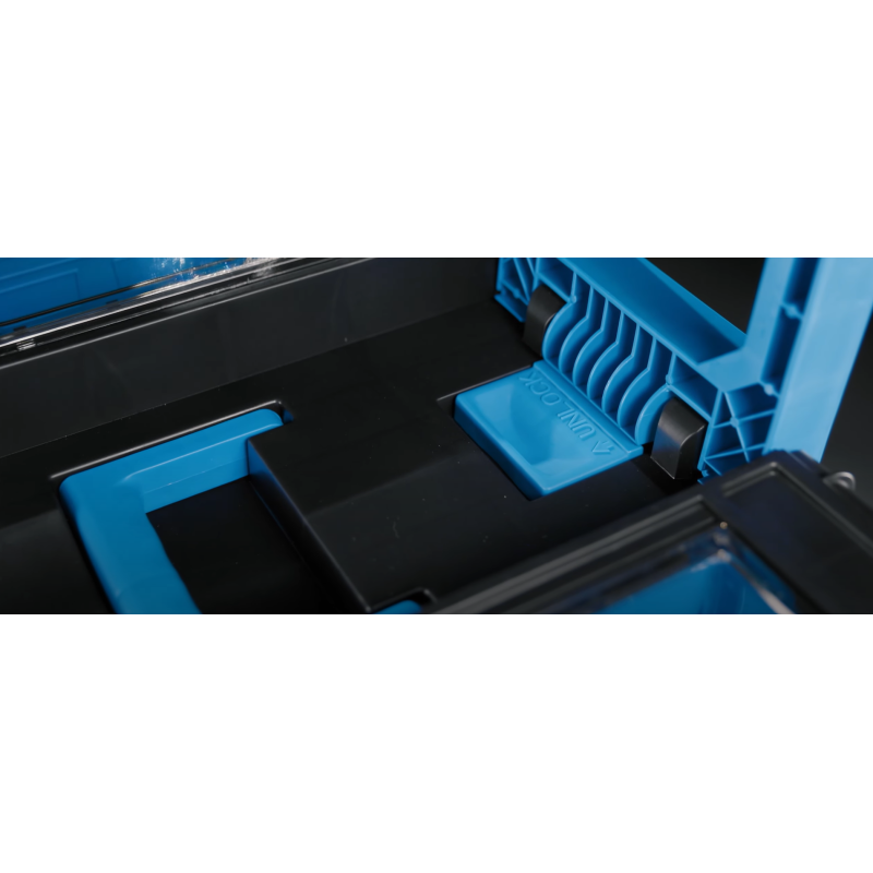 - Die untere Box verfügt über integrierte Rollen und bildet die Basis des gesamten mobilen Werkzeugkastens; sie kann als praktischer Werkzeugbehälter dienen.