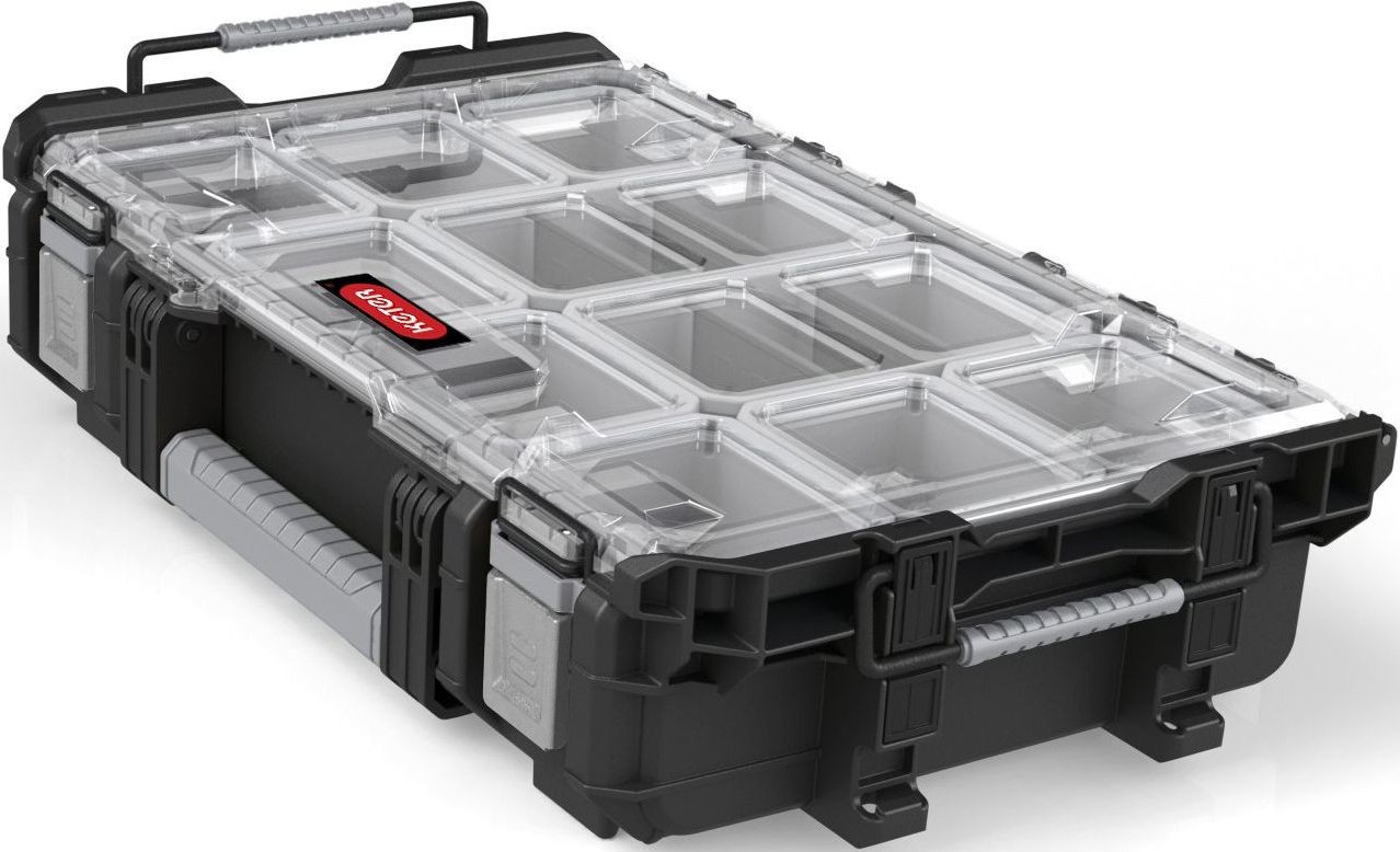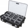 Der GEAR-Organizer ist ideal für Profis und bietet eine bequeme Möglichkeit zur Aufbewahrung und zum Transport von Kleinteilen und Zubehör. Er ist mit 10 herausnehmbaren Behältern in zwei verschiedenen Größen ausgestattet. Der transparente Deckel ermöglicht es, den Inhalt des Organizers zu überblicken, ohne ihn öffnen zu müssen. Er kann einzeln verwendet werden, bildet jedoch in Kombination mit den anderen Kisten der GEAR-Serie ein komplettes System zur Aufbewahrung von Werkzeugen.
