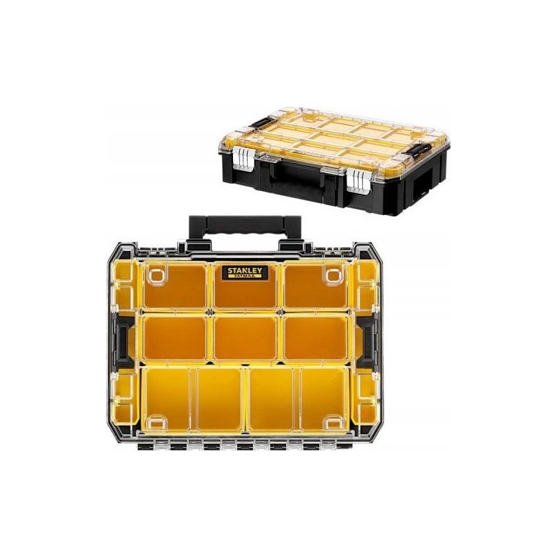Der STANLEY PRO-STACK FMST82967-9 Organizer ist eine praktische und robuste Lösung zur Aufbewahrung von Kleinwerkzeugen und Zubehör. Mit einem Fassungsvermögen von 7,8 Litern und einer maximalen Belastbarkeit von 20 kg eignet er sich sowohl für die Werkstatt als auch für den Einsatz im Außendienst. Der transparente Deckel ermöglicht einen schnellen Überblick über den Inhalt, und die robuste Konstruktion in den Farben Schwarz, Gelb und Transparent garantiert eine lange Lebensdauer. Die Abmessungen des Organizers betragen 44 x 34 x 12 cm.