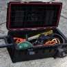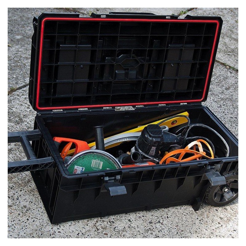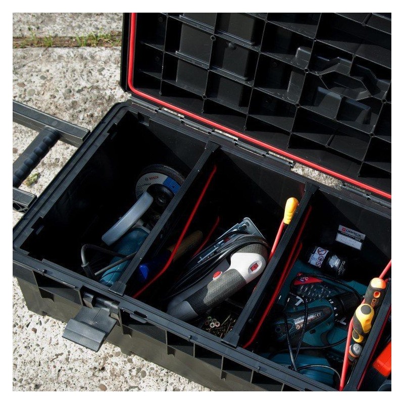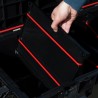 Der mobile Werkzeugkoffer ermöglicht den Transport langer Elektrowerkzeuge wie z. B. Schlaghämmer, Winkelschleifer oder Betonmischer zusammen mit dem notwendigen Zubehör. Seine überdurchschnittlichen Abmessungen machen ihn zu einem einzigartigen Produkt in seiner Kategorie. Sie ist mit drei verstellbaren Fächern ausgestattet – zwei mit elastischen Gurten und einem Multi-Fach, das dank verschiedener Halterungen für Handwerkzeuge eine einfache Ordnung im Inneren der Kiste ermöglicht.