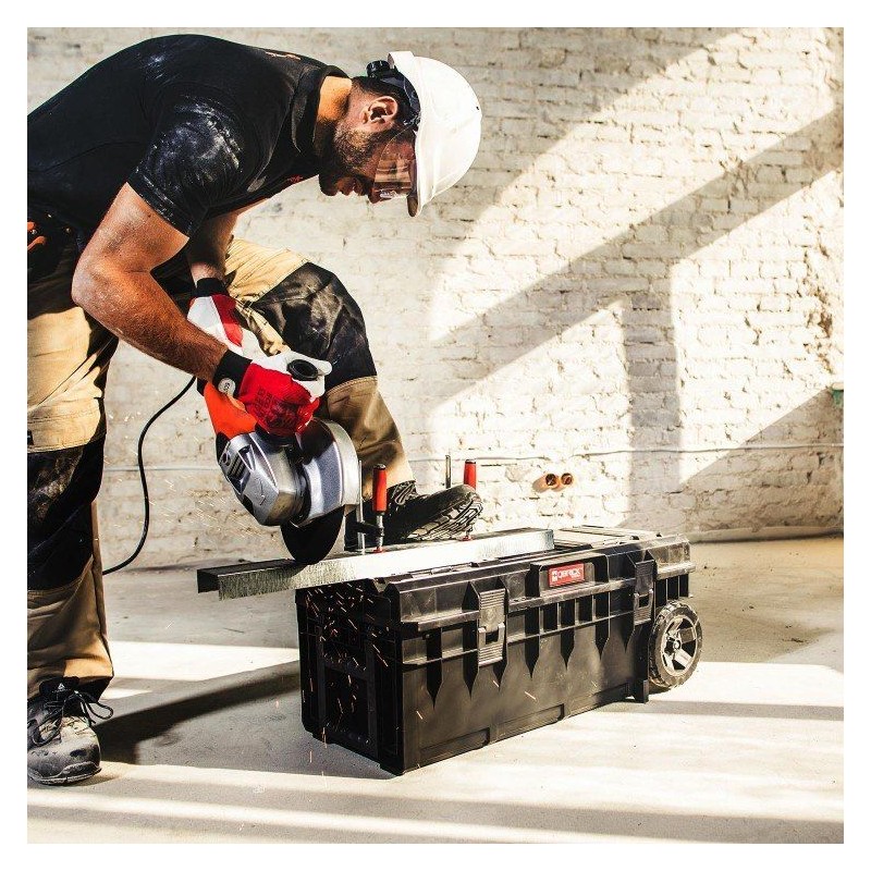 Technik ist die professionellste Version des Qbrick-Systems und mit innovativen Aluminium-Montageschienen ausgestattet, die den Einsatz klassischer Tischlerzwingen ermöglichen. Dank dieser Schienen können die Qbrick-System-Technik-Kisten als Arbeitstische dienen, die für präzises Zuschneiden, Verleimen oder Festhalten unerlässlich sind.