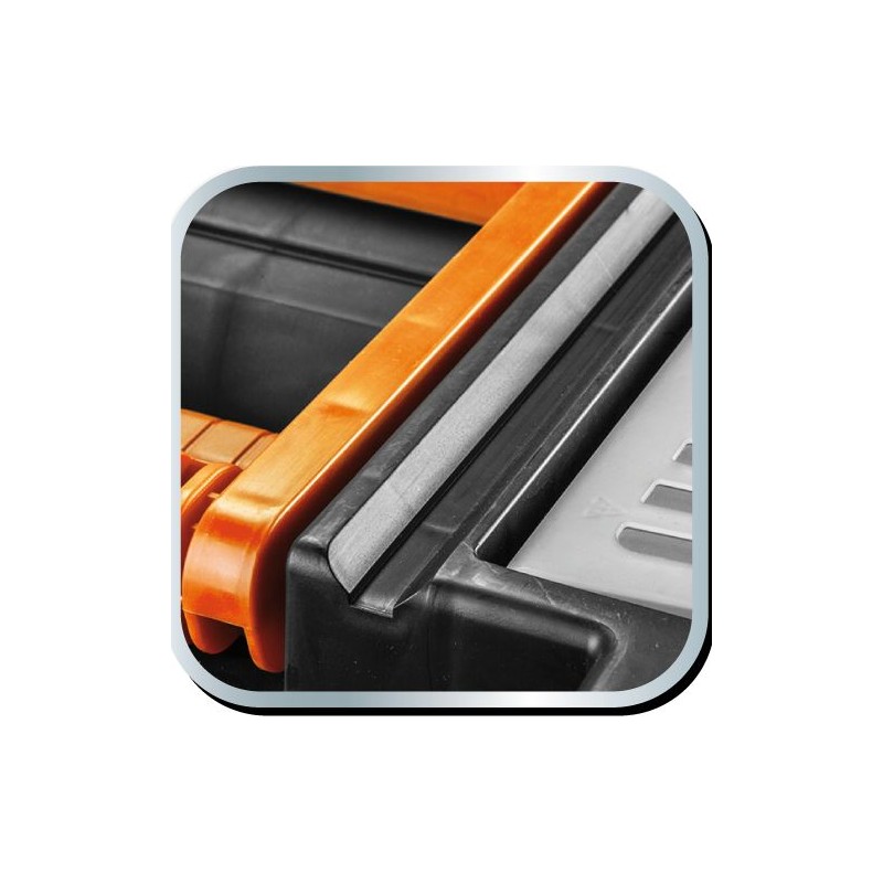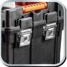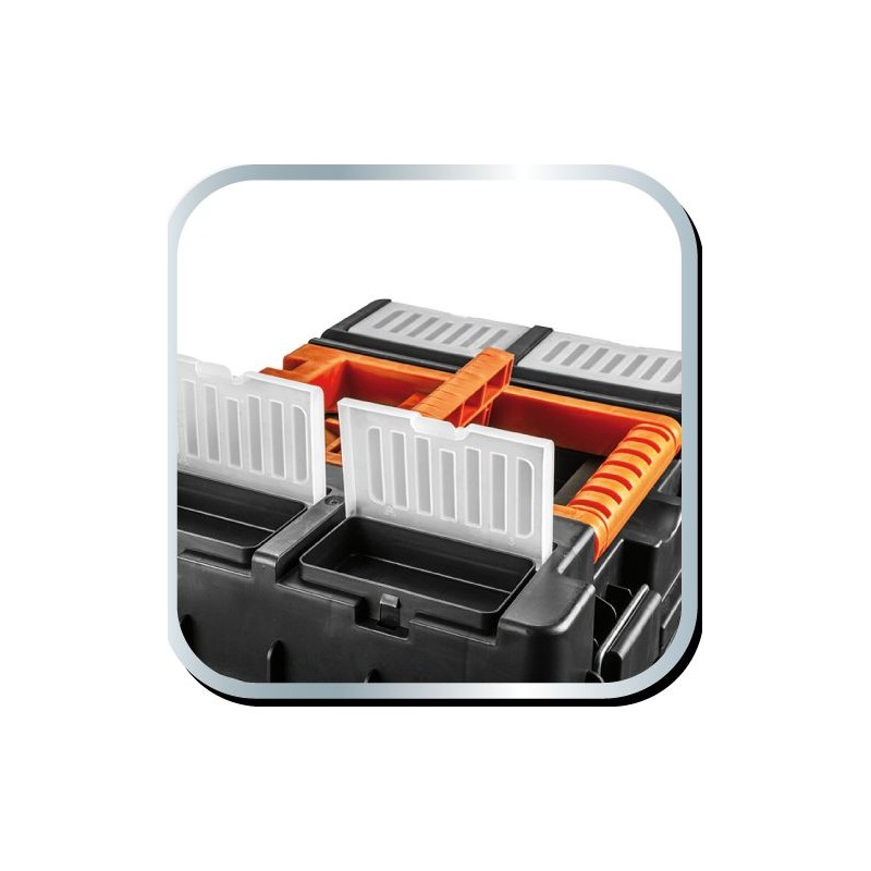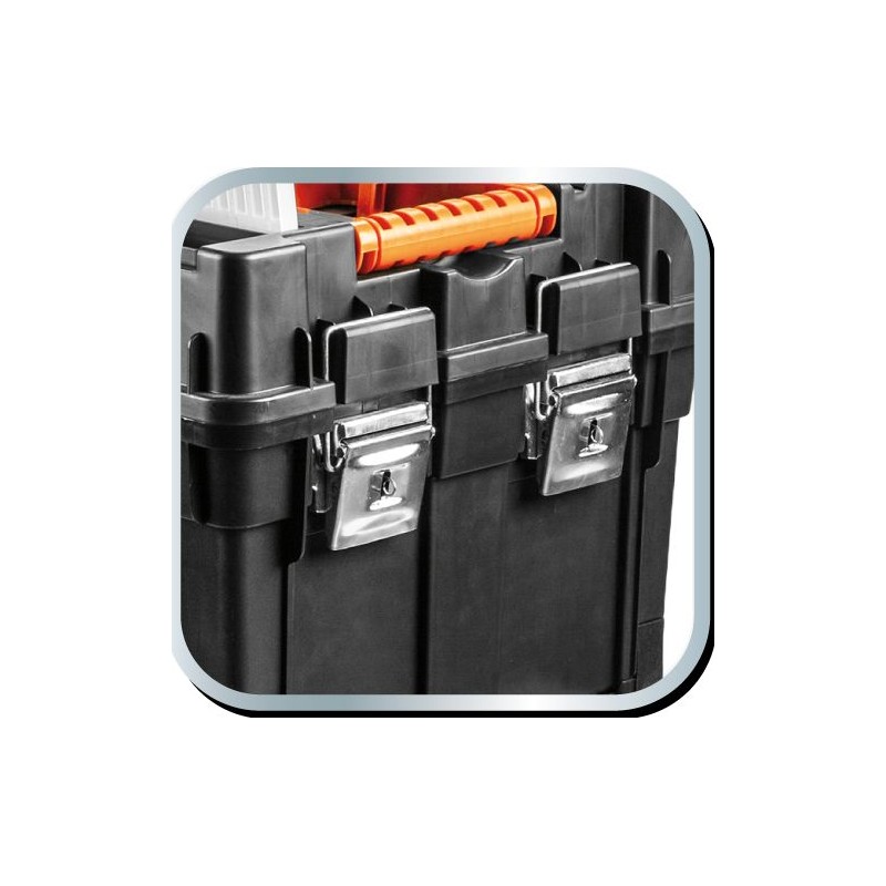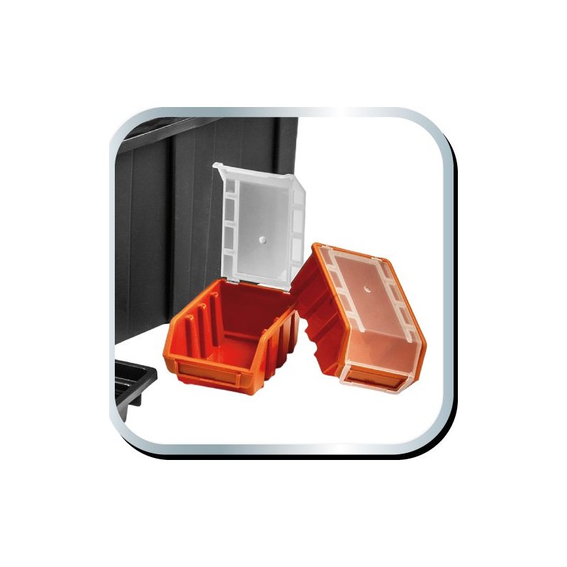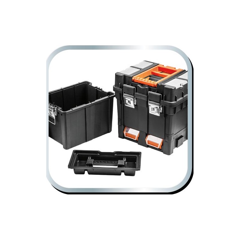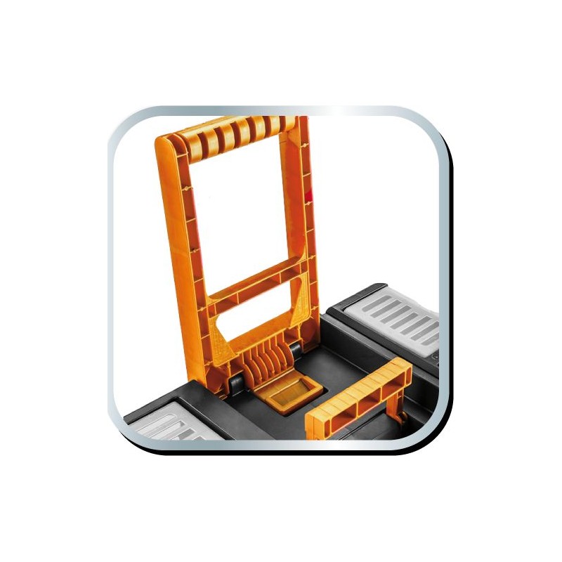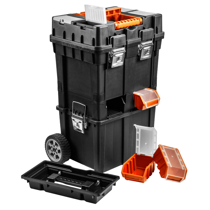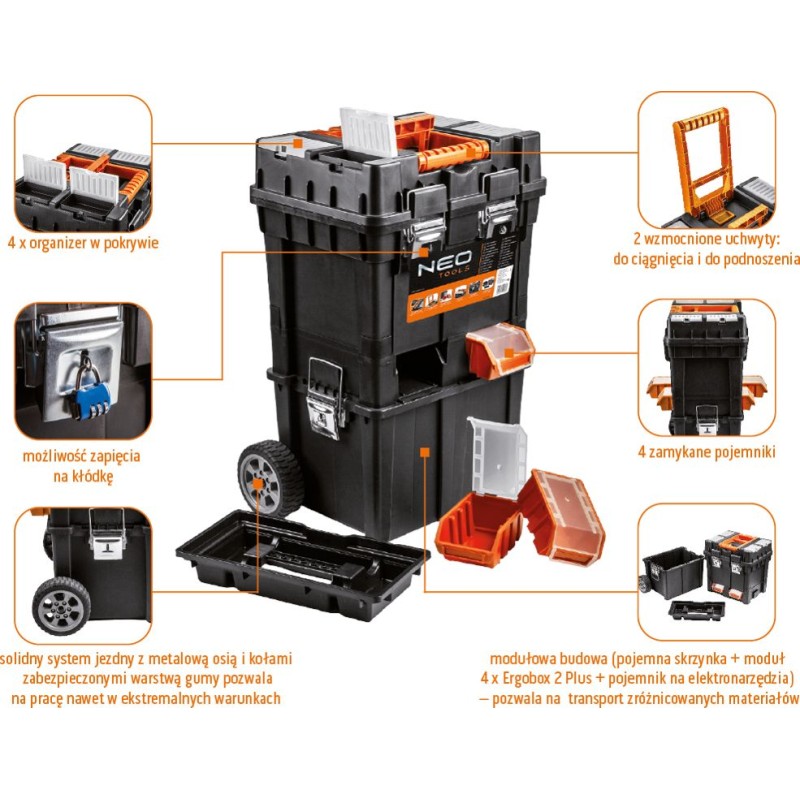 Die geräumige und mobile Werkzeugwerkstatt besteht aus strapazierfähigem Kunststoff mit Metallverschlüssen. Sie ist mit Rädern ausgestattet, um den Transport zu erleichtern. Die Werkstatt besteht aus 3 funktionalen Elementen, die in einzelne Module zerlegt werden können. Der obere Teil besteht aus einem Werkzeugkasten, das mittlere Modul aus vier Ergoboxen und der untere Teil aus einer geräumigen Kiste für größere Werkzeuge. Die Werkstatt verfügt außerdem über 4 Organizer zur Aufbewahrung von Kleinteilen, eine Innenschale und zwei praktische Griffe zum Tragen oder Ziehen.
