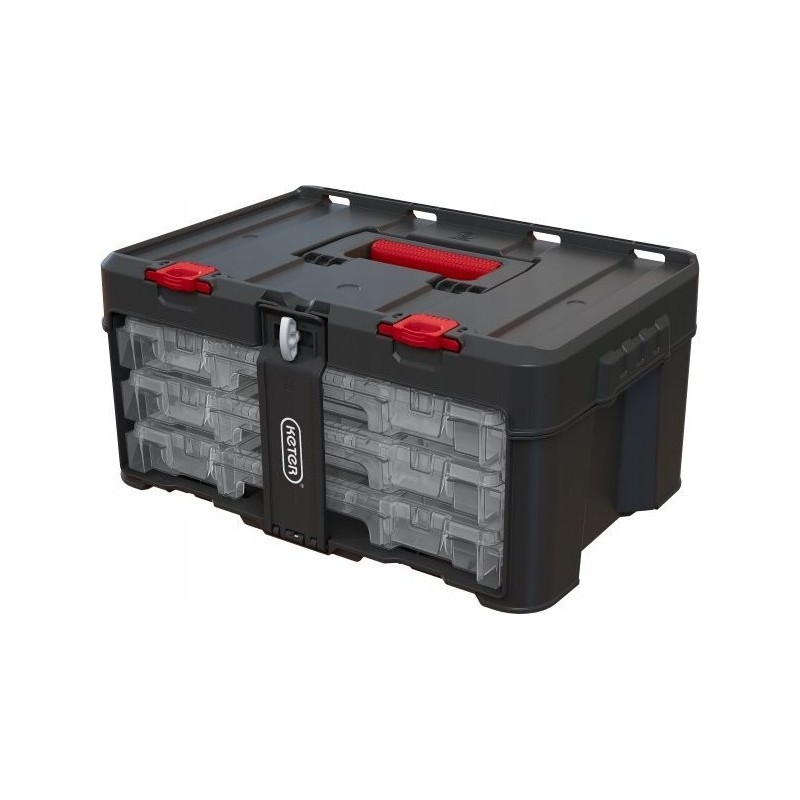 Die Box verfügt über einen oberen Griff mit weicher Gummibeschichtung sowie seitliche Griffe für bequemes Tragen. Die Konstruktion der Schubladen ermöglicht ein leichtes Herausziehen und Schließen.
