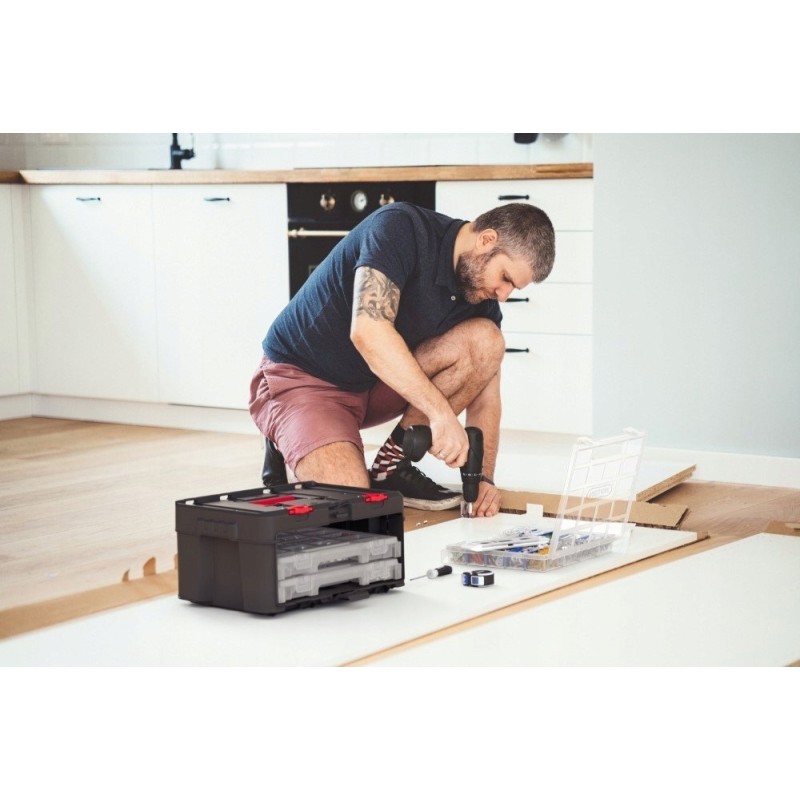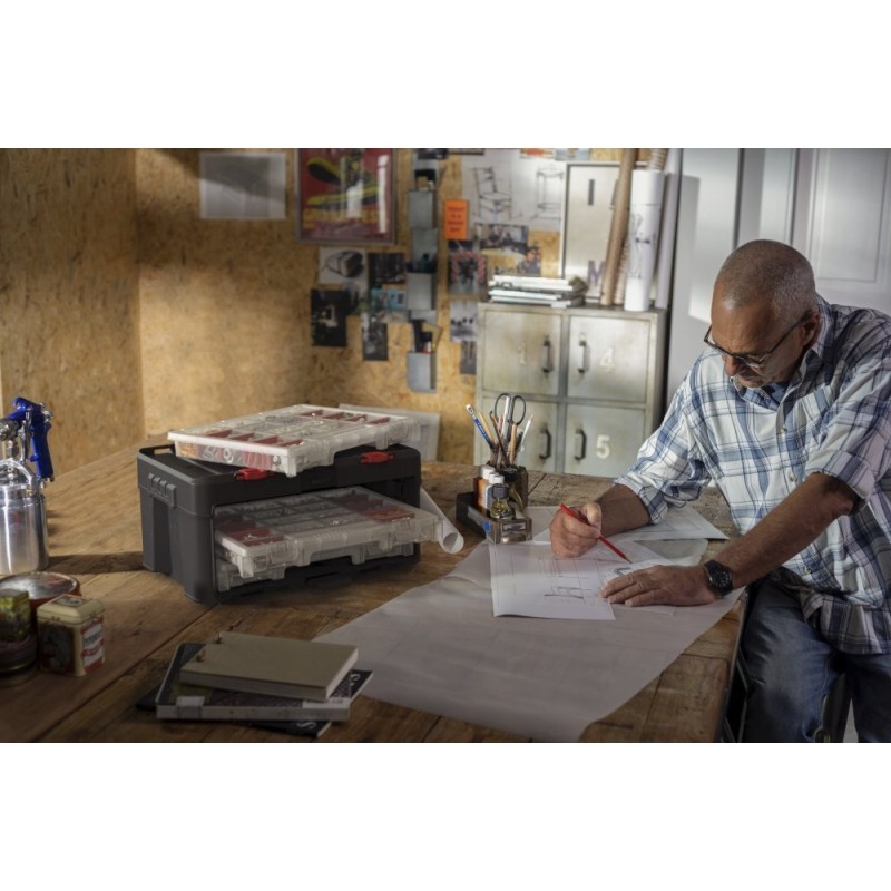 Das modulare Set bietet die Möglichkeit, einen der praktischen Organizer an jeden beliebigen Ort mitzunehmen. Jeder Behälter lässt sich mithilfe von verstellbaren Trennwänden leicht anpassen, um einen Stauraum zu schaffen, der Ihren Aufbewahrungsbedürfnissen am besten entspricht.