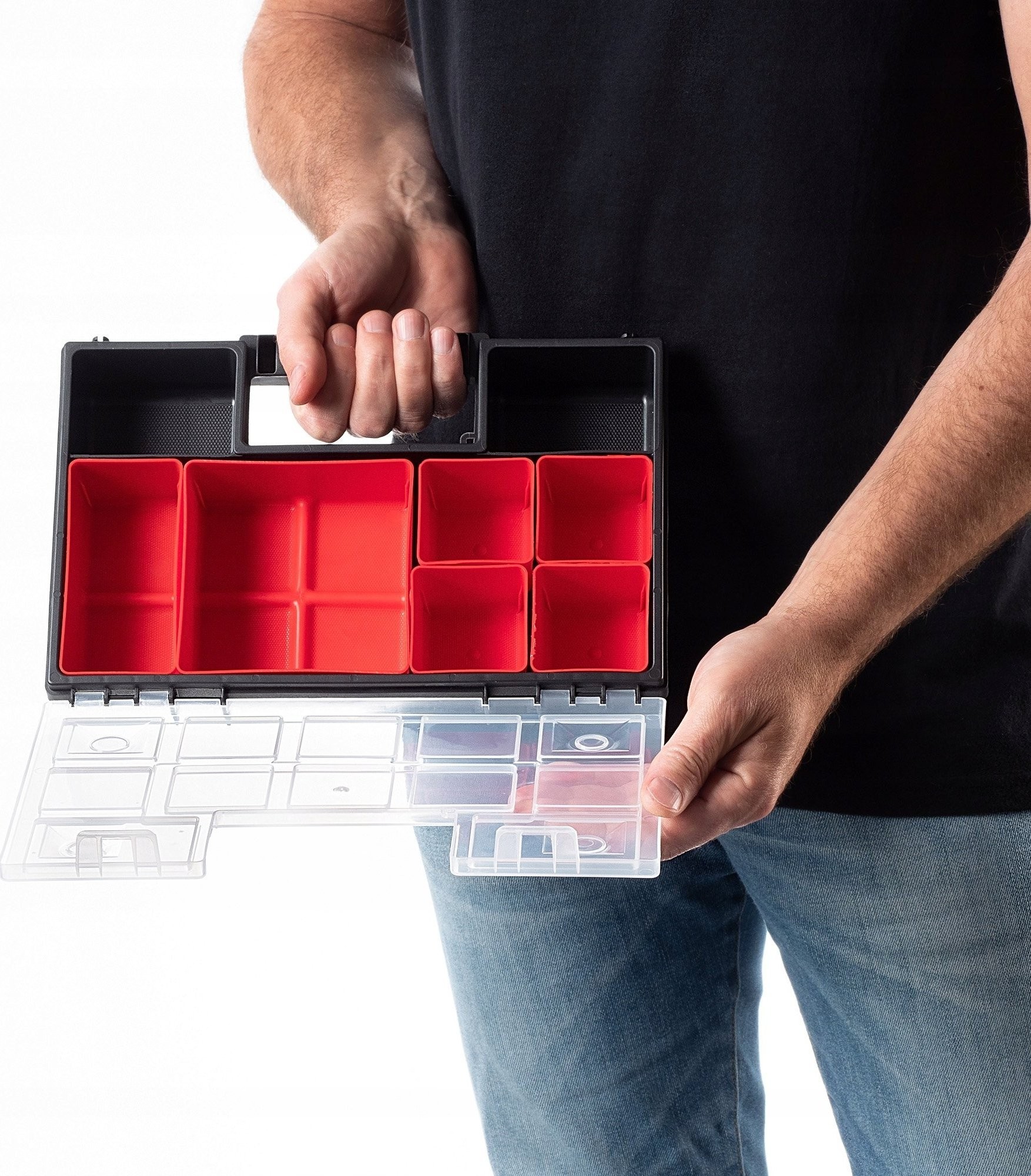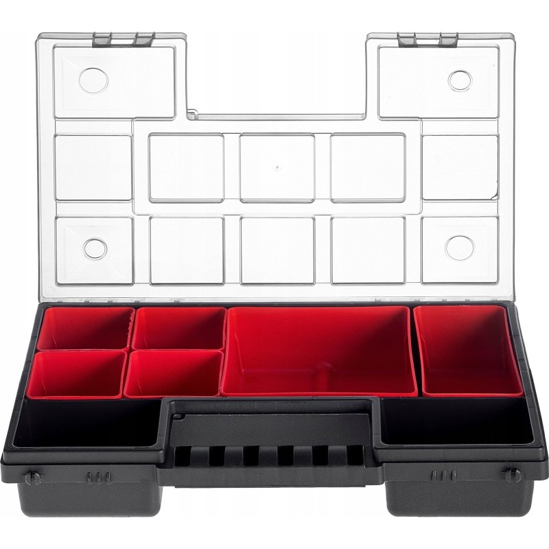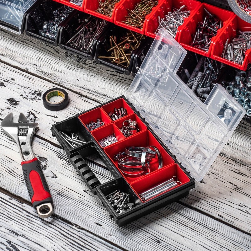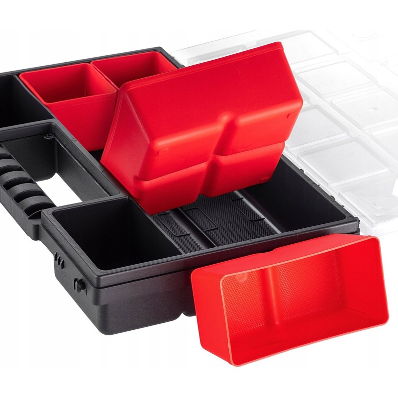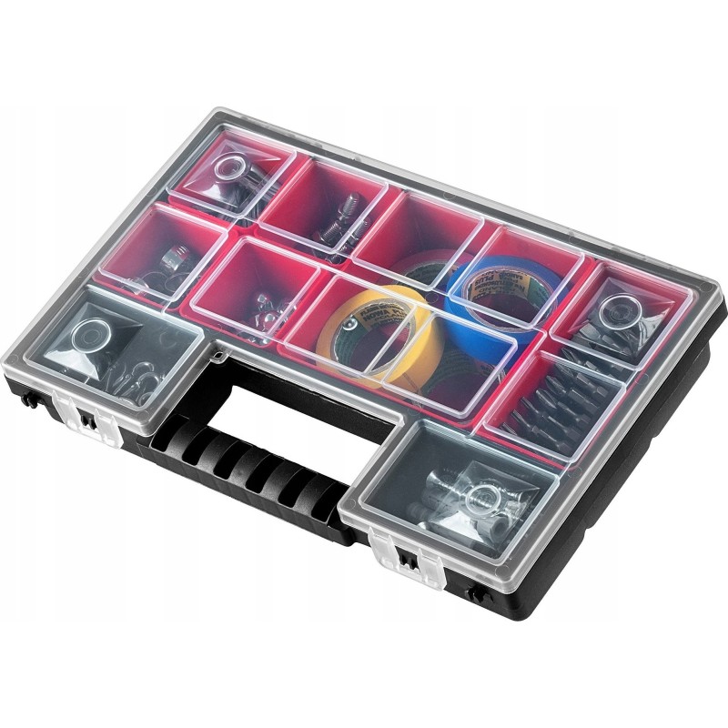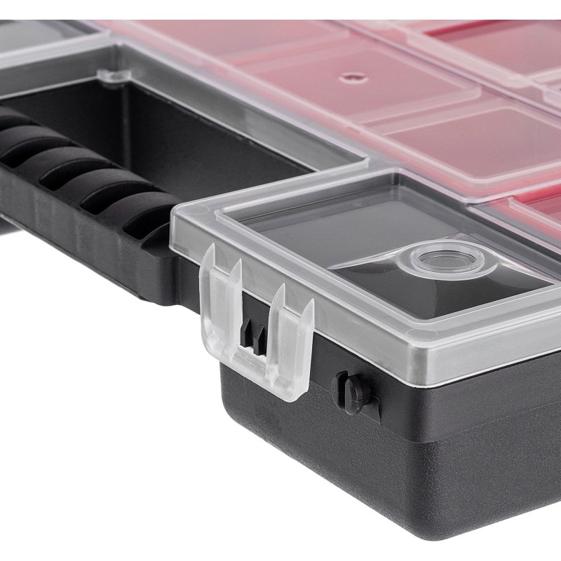 ROBUST – Der Korpus und der transparente Deckel bestehen aus robustem Kunststoff. Der Werkzeugorganizer verfügt über stabile Verschlüsse, die den Deckel sichern und den Inhalt zuverlässig vor unerwartetem Herausfallen schützen.