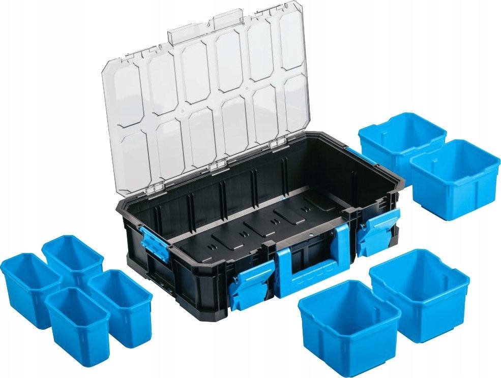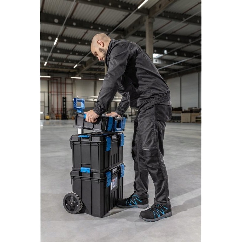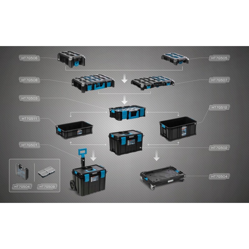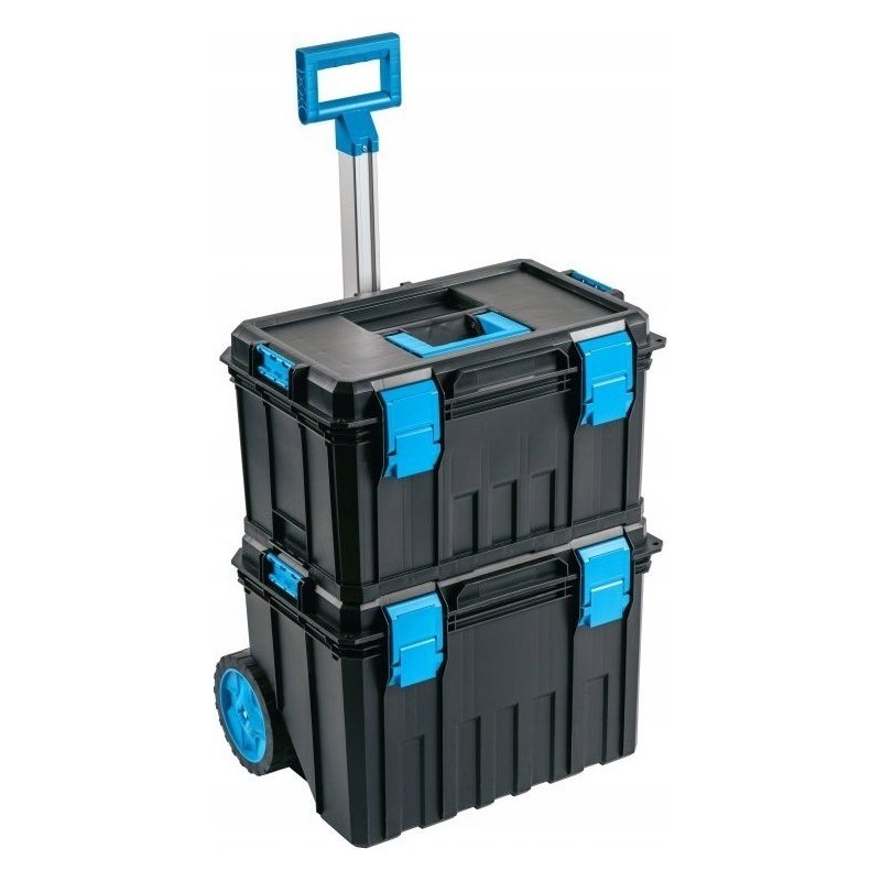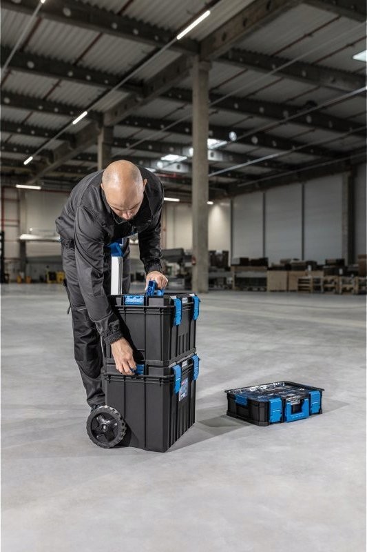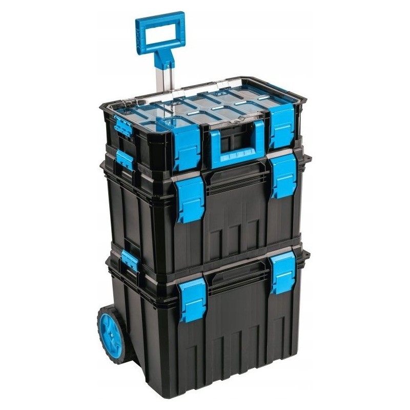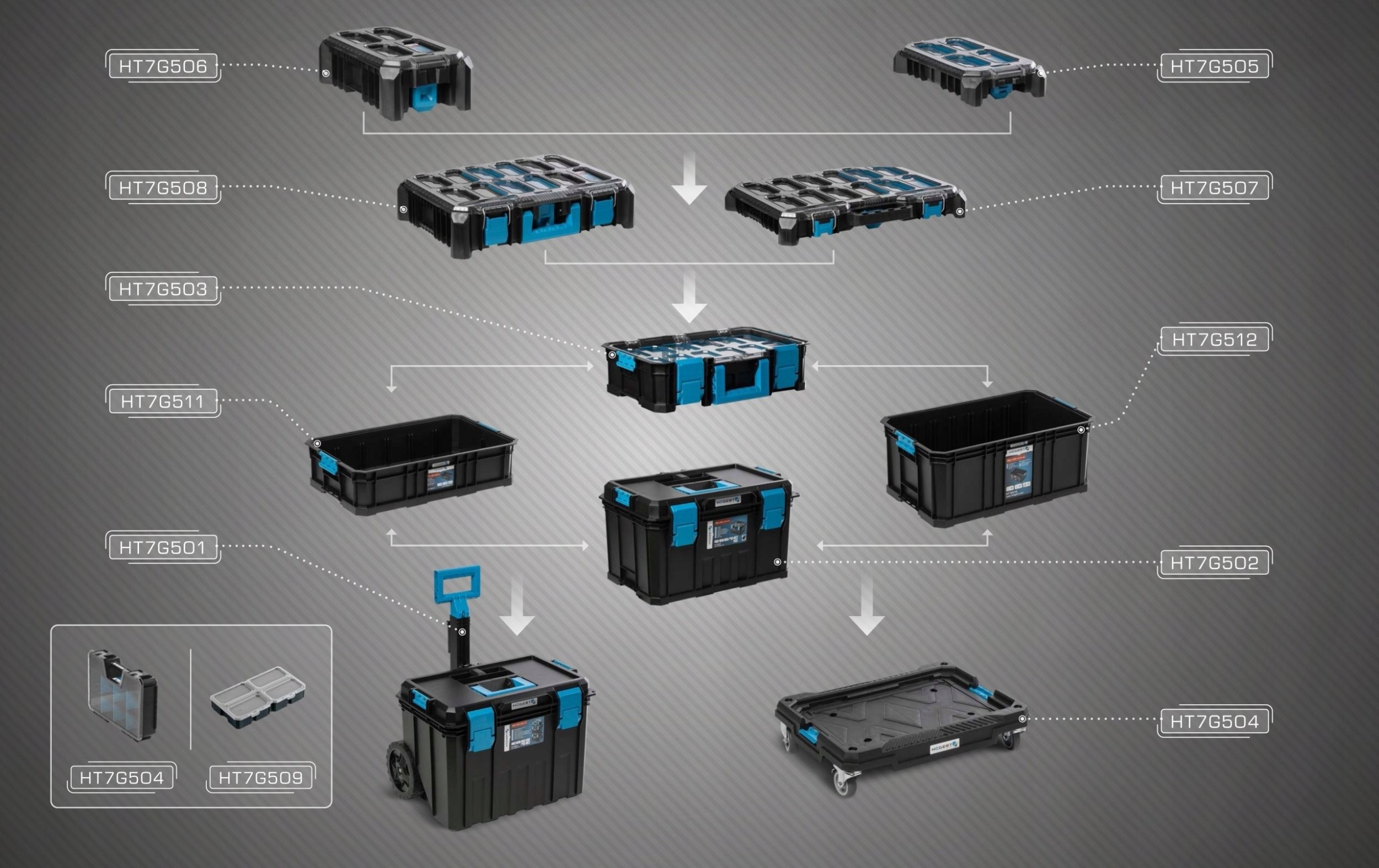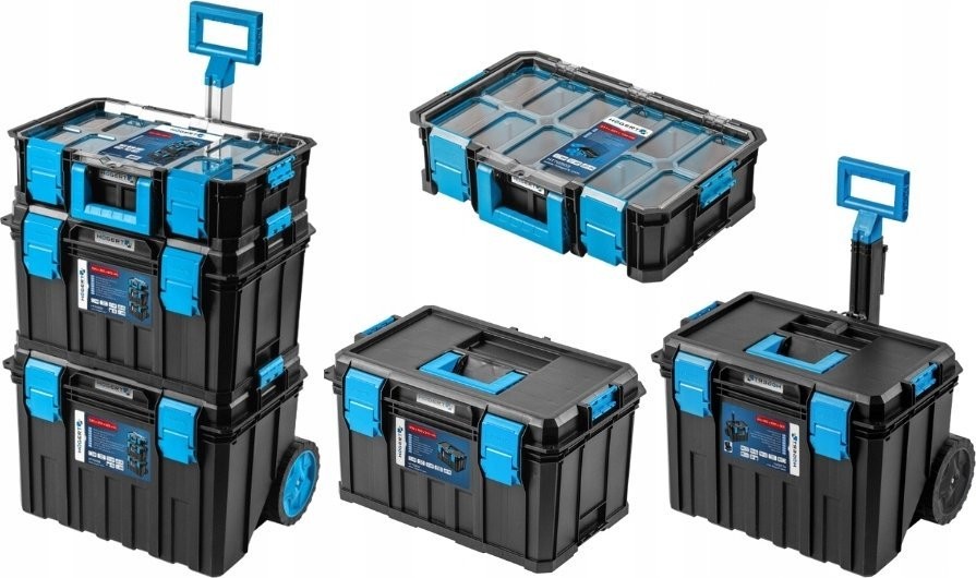 Das zusammenklappbare 4-in-1-Kisten-Set ist eine Lösung, die speziell für anspruchsvolle Anwender entwickelt wurde. Das Set umfasst die Kisten: HT7G501, HT7G502 und HT7G503. Die Kisten sind aus hochwertigen Materialien gefertigt, die ihre Robustheit und Widerstandsfähigkeit gegen Beschädigungen gewährleisten. Darüber hinaus sind die Kisten staubdicht und wasserabweisend. Die robuste Konstruktion der Wände, verstärkt durch ABS-Verschlüsse, sorgt für eine lange Lebensdauer ohne Beschädigungsrisiko. Das Kofferset ist mit einem praktischen Innentragegriff sowie großen, gummibeschichteten Rädern ausgestattet, was den Transport erleichtert. Es eignet sich hervorragend zur Aufbewahrung und zum Transport verschiedener Gegenstände. Empfohlen sowohl für den professionellen als auch für den privaten Gebrauch. Die ideale Wahl für Branchen wie Bauwesen, Industrie, Automobilbranche oder Logistik.