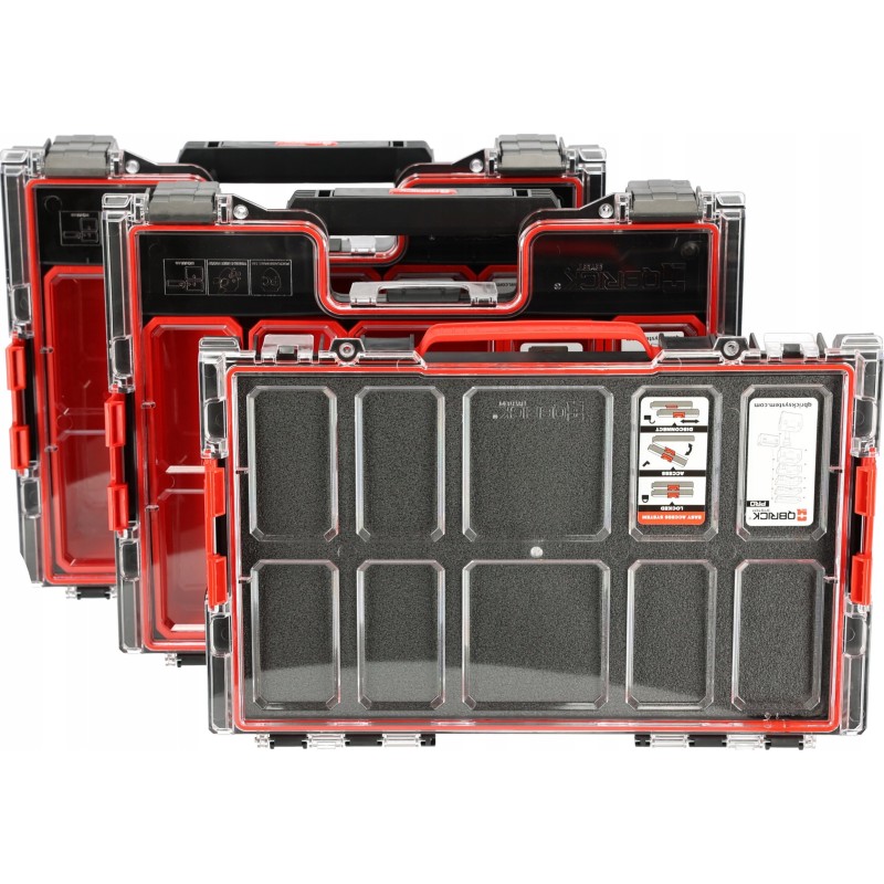 Zu den wichtigsten Merkmalen dieses Organizers gehören ein innovatives System für einfachen Zugriff, eine Dichtung im Deckel, ein extrem robuster Polycarbonat-Deckel, ein ergonomischer Griff sowie seitliche Verbindungselemente aus Polyamid.
