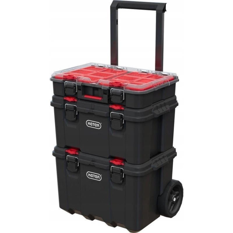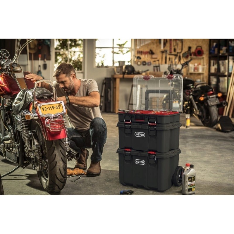 Das Keter Stack n Roll-Kisten-Set besteht aus drei praktischen und robusten Kisten zur Aufbewahrung verschiedener Werkzeuge und Werkstattzubehör. Es eignet sich perfekt für jede Garage oder jede Heimwerkstatt und erleichtert es, am Arbeitsplatz perfekte Ordnung zu halten.